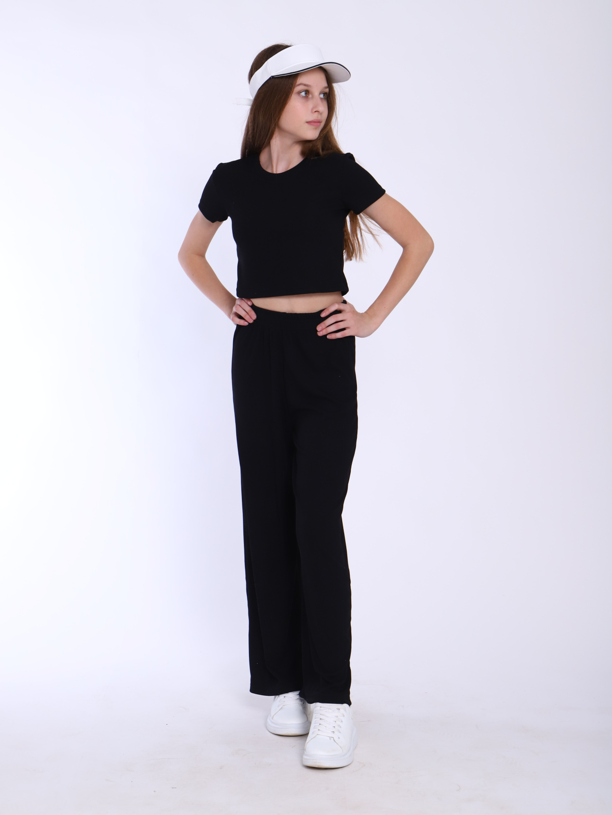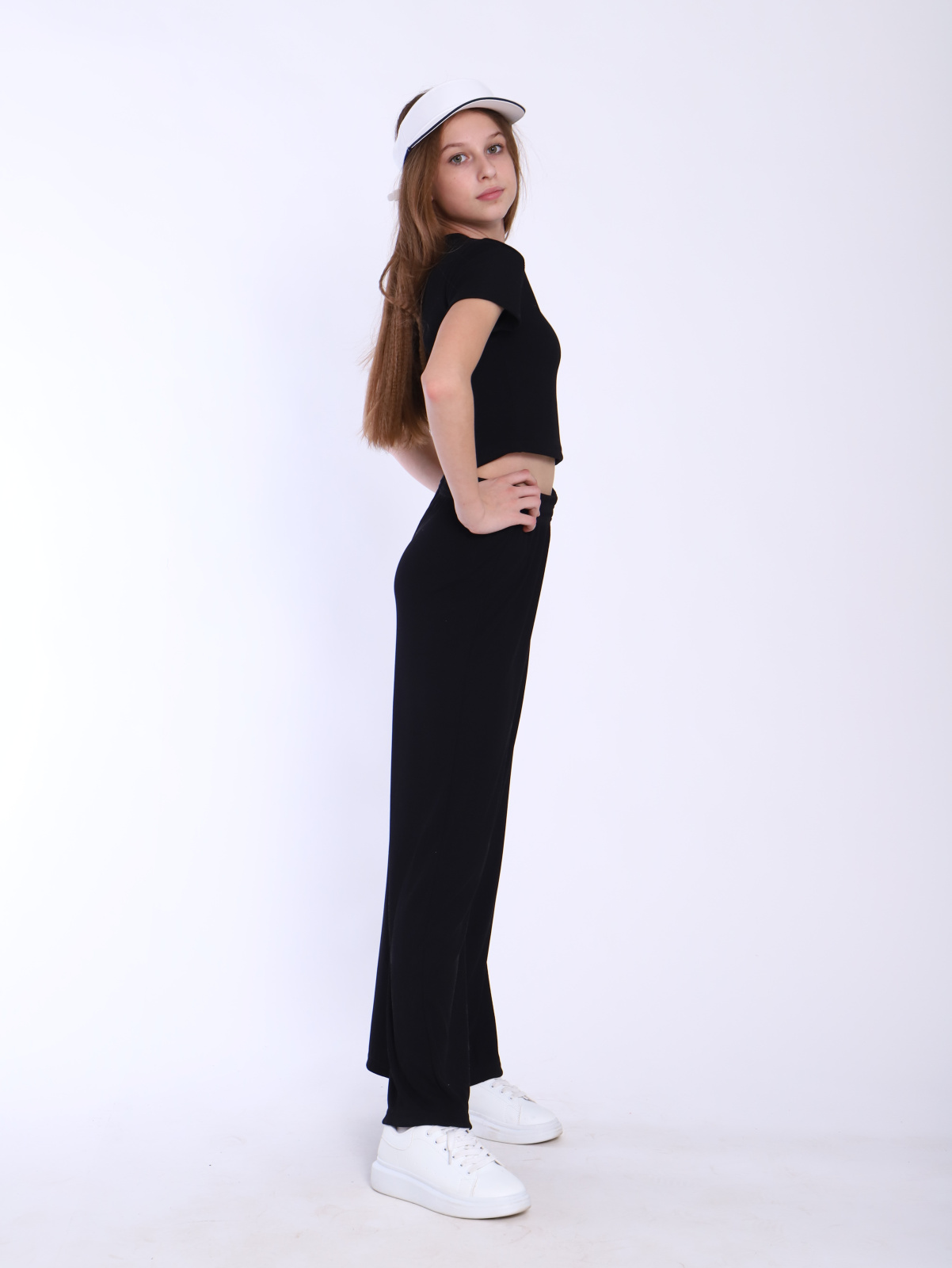 Универсальный подростковый комплект для девочек летний. Выполнен из трендовой трикотажного материала " лапша ". Фактура материала в полоску визуально вытягивает силуэт и подчеркивает линии фигуры. Домашний костюм в рубчик не колется, не мнётся и не вытягивается в коленях сохраняя форму весь период использования. Брючный комплект двойка выполнен в свободном стиле оверсайз oversize. Модные широкие брюки палаццо имеют завышенную талию. Пояс брюк кюлотов мягкий и эластичный на резинке. Уютный спортивный костюм лапша - прекрасно подойдет в качестве креативного образа на работу в офис. Изысканный комфортный комплект детской одежды не стесняет движения. В комплекте летнем удобно заниматься активными спортивными играми, заниматься спортом, фитнесом, танцами, йогой. Яркий летний комплект идеально подходит для вечерних встреч с друзьями, путешествий, отпуска к морю, детского лагеря, и в качестве стильной домашней одежды. Легкий модный комплект включает в себя облегающую укороченную футболка топ. В комплекте удобно делать домашние дела. Повседневно двойку можно носить и в кино и в игровой центр весной или летом, ранней осенью. Летний наряд oversize можно надеть в школу на выпускной, на работу, в институт или использовать в качестве деловой офисной одежды на каждый день. Благодаря своей универсальности он идеально дополнит домашний гардероб. Для тренировок в зале и фитнеса - это тоже отличный вариант. Элегантные широкие брюки имеют свободный покрой, завышенную посадку и подходят для любого типа фигуры и роста - для высоких и невысоких девушек.