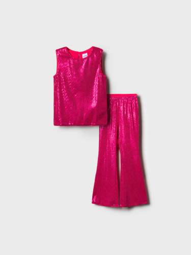 Яркий нарядный костюм для девочки от PlayToday — эффектный наряд для праздников и стильных выходов. В набор входят топ без рукавов и расклёшенные легинсы, выполненные из ткани с паетками. Мягкий материал с эластаном тянется и не сковывает движения, а подкладка из хлопка делает изделие комфортным при носке.Преимущества модели:+ ткань с паетками— создаёт праздничное настроение и сияние в движении+ эластичный материал — идеально садится по фигуре, не сковывает движений+ мягкая подкладка с хлопком — комфорт и приятные ощущения к телу+ топ без рукавов с застёжкой на спинке — удобно надевать и снимать+ брюки-клёш — модный силуэт, визуально вытягивающий фигуру+ универсальный праздничный комплект — можно носить вместе или отдельноКогда и как носить:Идеален для праздников, дней рождения, концертов, нового года, танцевальных выступлений, фотосессий и стильных прогулок.Советы по стилю:Сочетайте с короткой курткой, кардиганом или жакетом от PlayToday. В прохладную погоду добавьте лонгслив под топ. В качестве обуви подойдут балетки, ботинки или кроссовки на платформе.Яркий подростковый костюм для девочек PlayToday — идеальное сочетание комфорта, моды и блеска для девочек, которые любят быть в центре внимания. Подходит для девочек подростков и школьниц от 8 лет. Верхняя ткань: 91% полиэстер, 5% люрекс, 4% эластанПодкладка: 60% хлопок, 35% полиэстер, 5% эластан