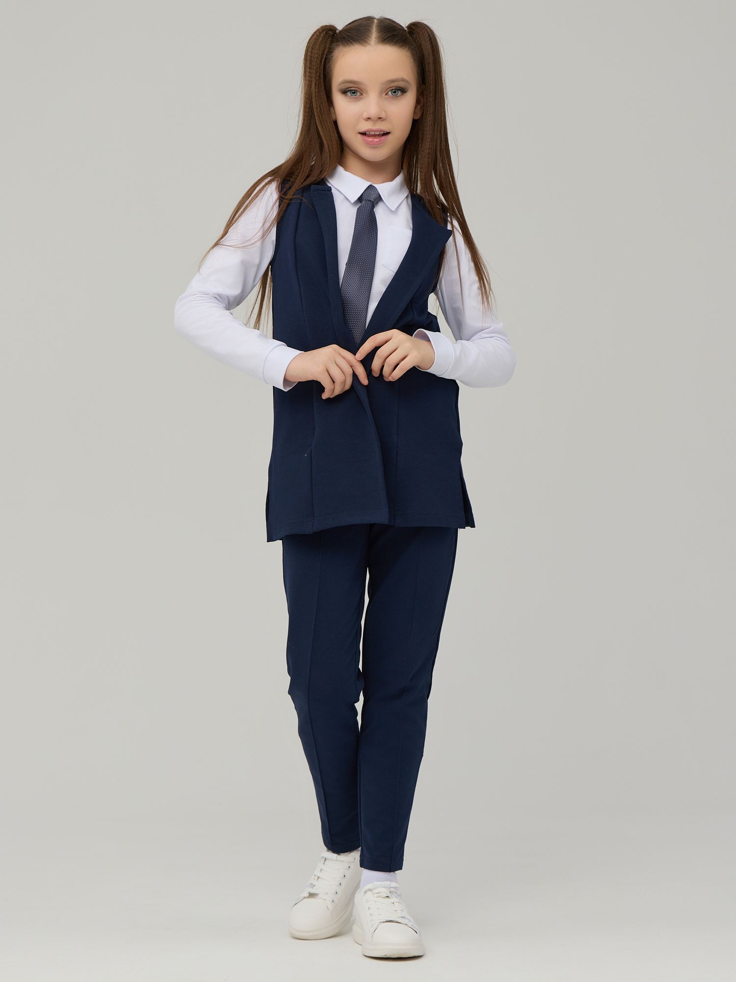 Школьный костюм из футера темно-синего цвета для девочки , состоит из жилета и брюк. Жилет без застежки, с боковыми разрезами и боковыми карманами. Длиной до середины бедра. Брюки зауженные с боковыми карманами. Спереди - отделка в виде застроченной стрелки. Пояс на удобной эластичной резинке. Изделие выполнено из трикотажа премиального качества - ПЕНЬЕ, с содержанием хлопка более 92%