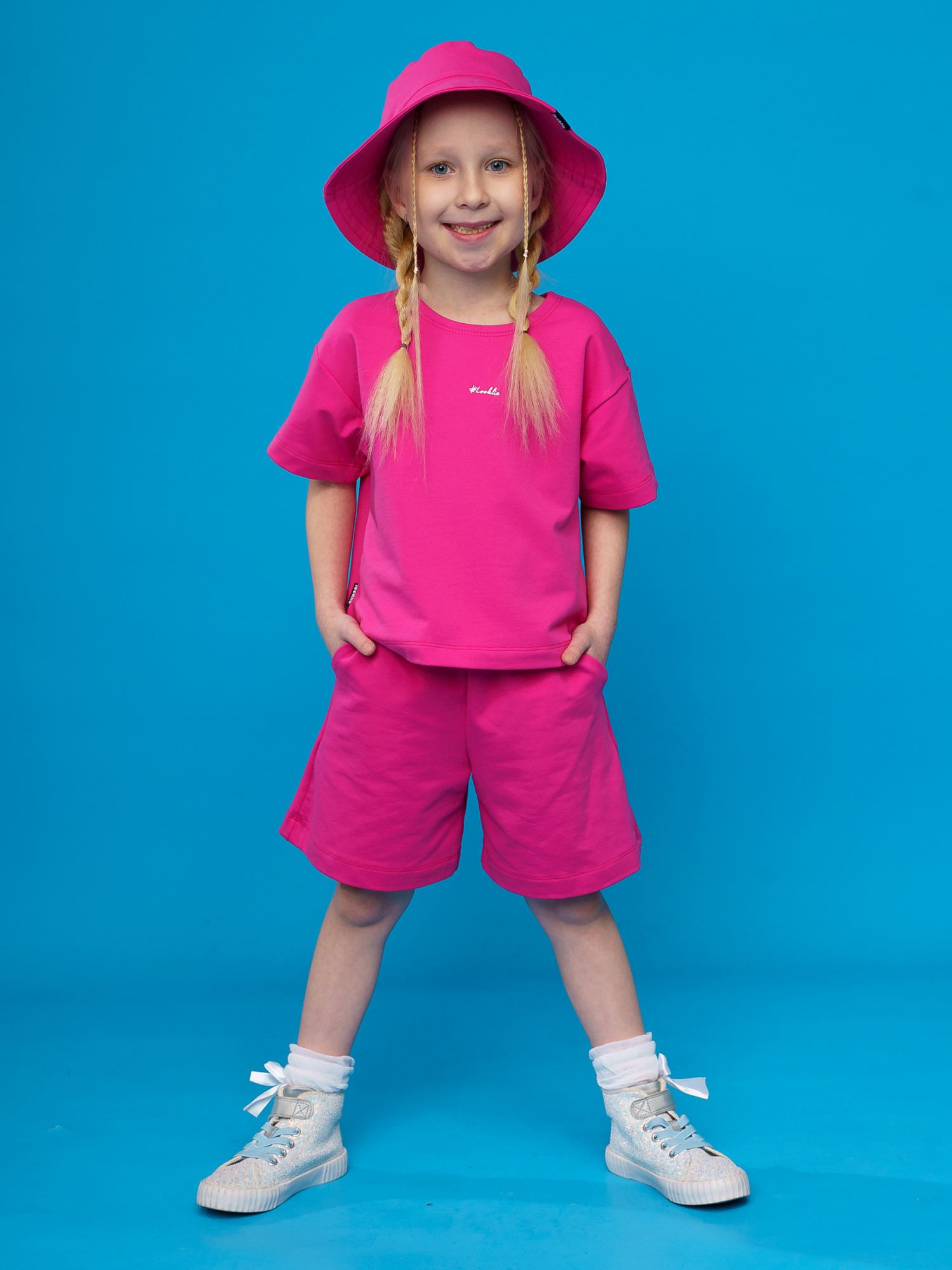 Костюм- двойка из футера сиреневого(фуксия) цвета для девочки . Состоит из футболки и шорт. Укороченная футболка свободного силуэта со спущенной линией плеча и рукавами длиной до локтя. Удобные шорты с боковыми карманами, пояс на эластичной резинке. Изделие выполнено из трикотажа премиального качества - ПЕНЬЕ, с содержанием хлопка более 92%
