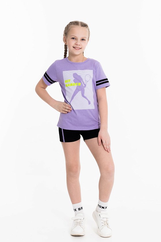 Костюм выполнен из кулирки, 100% хлопок. Футболка с коротким рукавом и круглым вырезом горловины, обработанным бейкой. На рукавах настрочены лампасы. Спереди нанесён принт. Шорты с поясом на резине и лампасами по бокам.