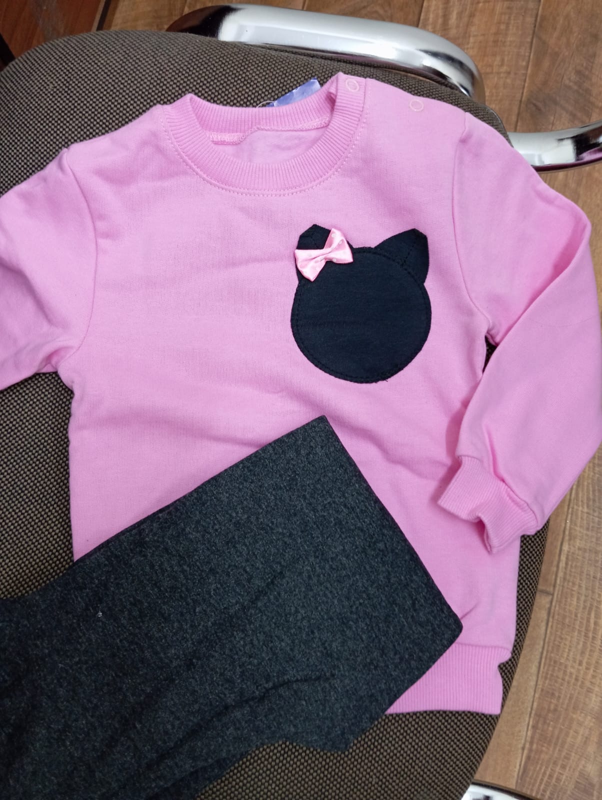 Уютный тёплый костюмчик для девочек. Толстовка на манжете снизу, застёжка "кнопки" по плечевому шву, на груди нашивка "кошечка". Брючки снизу на эластичном манжете, пояс на резинке.