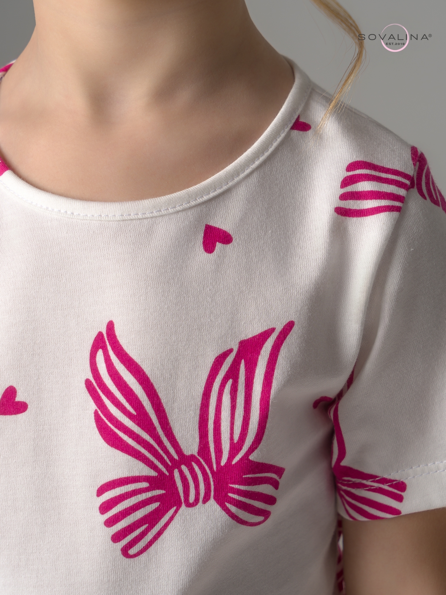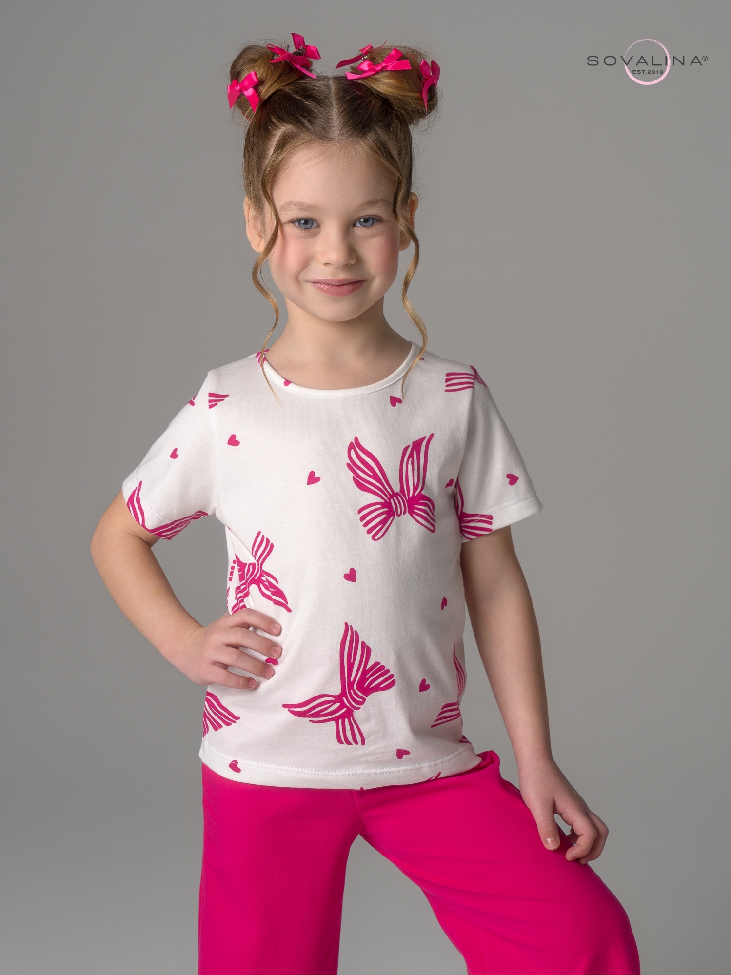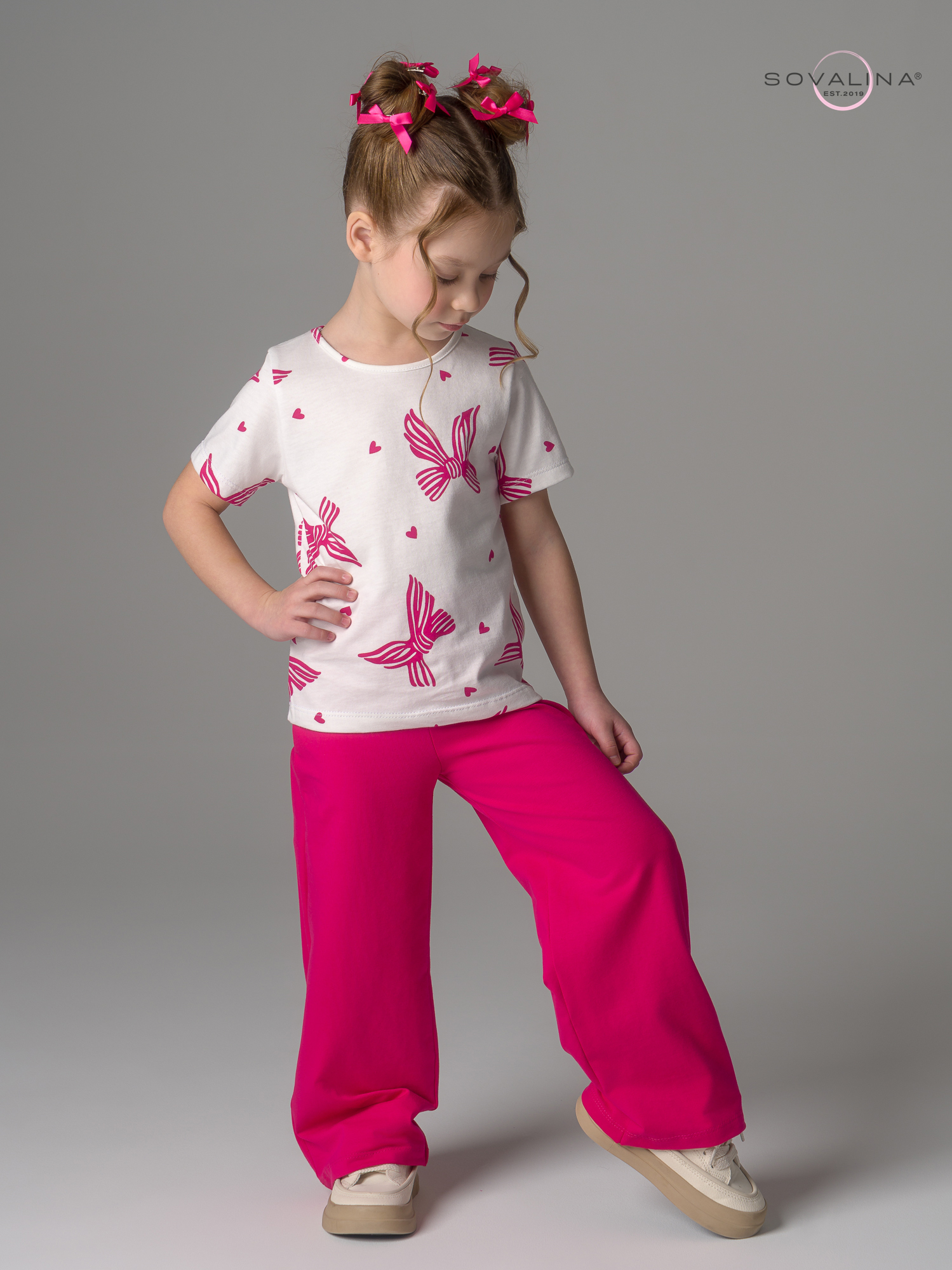 Комплект двойка TM SOVAlina для девочек, который позволит им чувствовать себя стильно и комфортно в любое время года, включая весенний и летний период. В комплект входит свободная футболка с принтом и короткими рукавами и брюки палаццо. Детский спортивный и стильный комплект подходит для садика. Широкие штаны клеш обладают свободным кроем. Хлопковая ткань и вшитая в пояс резинка создают комфорт и свободу в активностях ребенка. Эта милая футболка с расклешенными брюками и их яркий цвет придадут для девочки дополнительную индивидуальность на солнечное лето, теплую осень и отопительный сезон в помещении. Костюмчик изготовлен из высококачественного трикотажа, он хлопковый и легкий - идеальный выбор для активных игр в саду или как домашняя пижама для детей. Этот домашний костюмчик не только функционален, но также приятен наощупь благодаря тонкому дышащему материалу. Создайте своему ребенку возможность чувствовать себя уютно, модно и стильно одновременно!