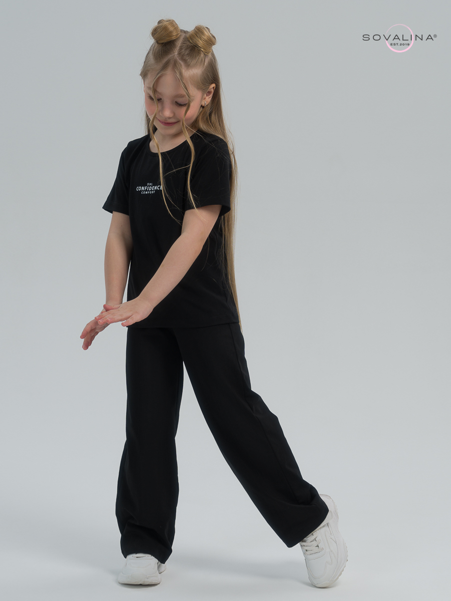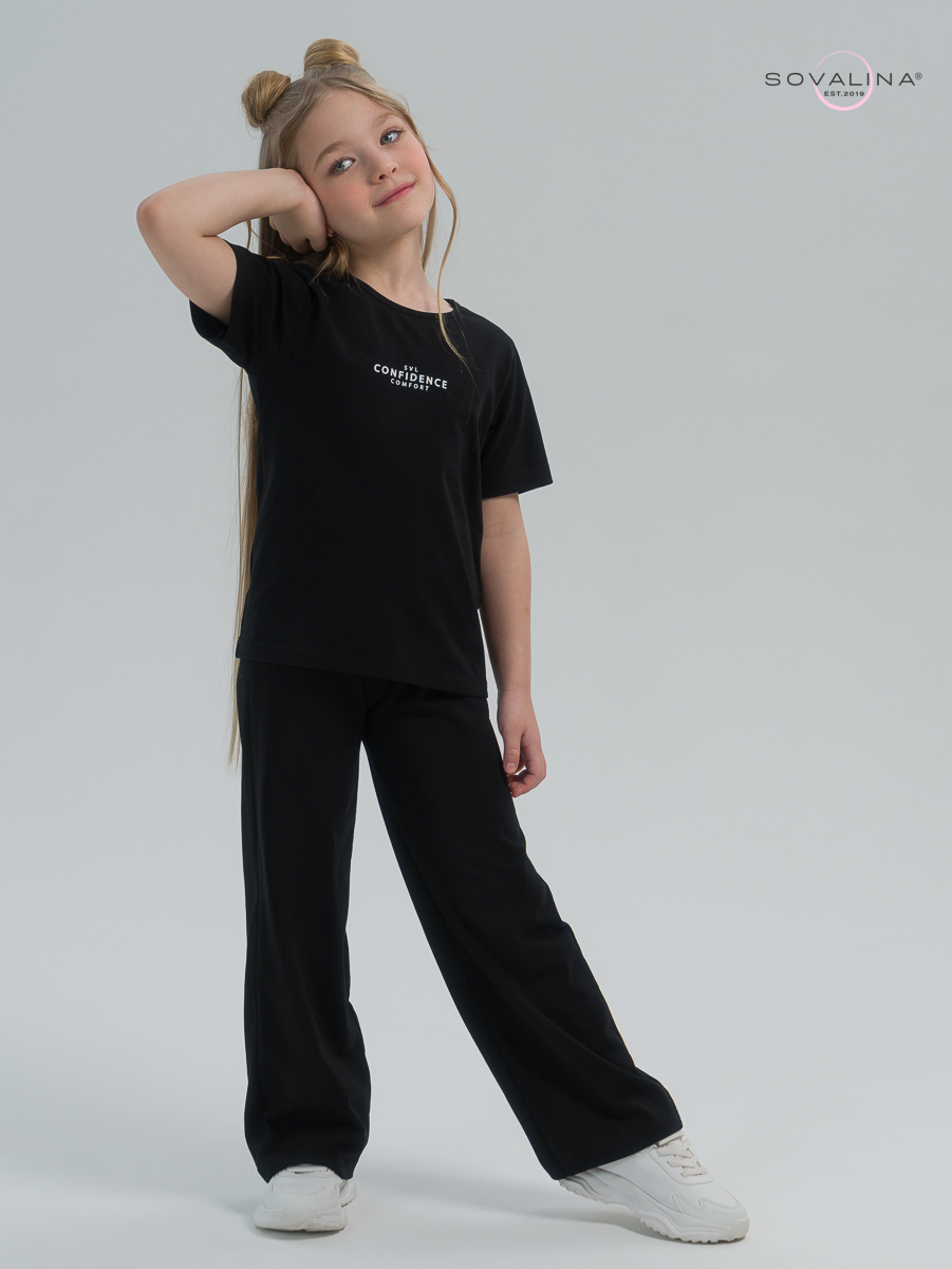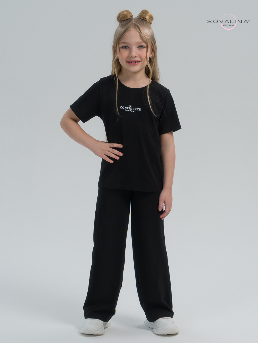 Комплект двойка TM SOVAlina для маленьких девочек, который позволит им чувствовать себя стильно и комфортно в любое время года, включая весенний и летний период. Он отлично подойдет для физкультуры, гимнастики, танцев или просто для повседневных прогулок и отдыха. В комплект входит футболка и брюки палаццо.  Широкие штаны клеш обладают свободным кроем. Хлопковая ткань и вшитая в пояс резинка создают комфорт и свободу в активностях ребенка. Эта милая футболка с расклешенными брюками и их яркий цвет придадут для девочки дополнительную индивидуальность на солнечное лето, теплую весну и отопительный сезон в помещении. Костюмчик изготовлен из высококачественного трикотажа, он хлопковый и легкий - идеальный выбор для активных игр в саду или домашняя пижама для детей. Элементы костюма можно носить как вместе, так и по отдельности.