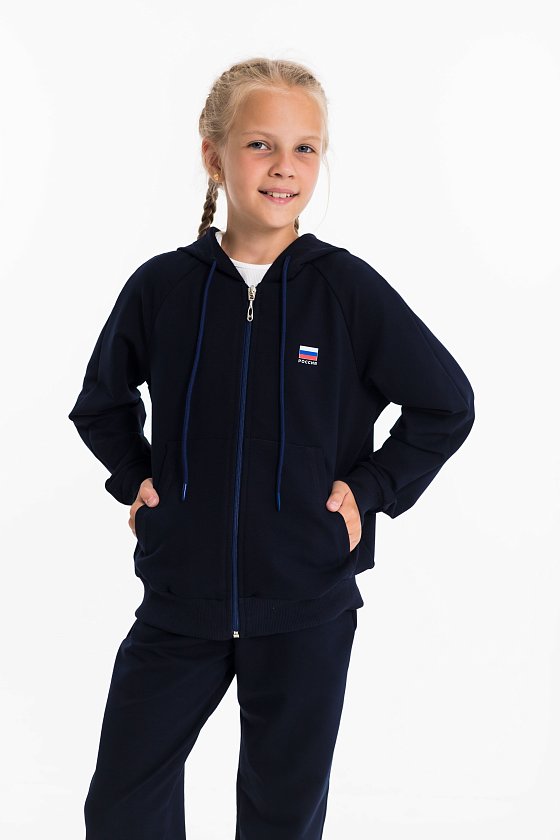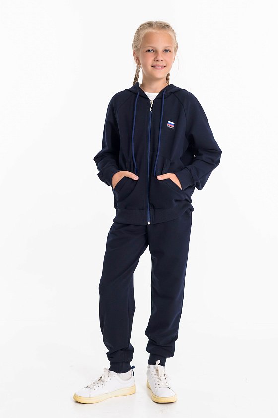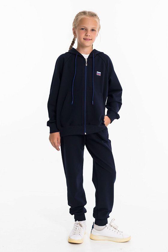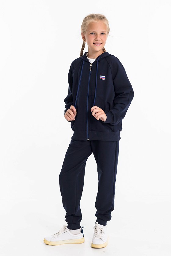 Детский костюм из однотонного футера с лайкрой — удобный и практичный вариант для школы и активного отдыха. Комплект состоит из брюк и толстовки. Брюки оснащены боковыми карманами, притачным поясом со шнуром для регулировки и манжетами по низу. Толстовка застегивается на молнию, имеет воротник, капюшон, манжеты и пояс из кашкорсе, а также боковые карманы. С левой стороны расположен принт в виде флага. Костюм отлично подходит для занятий физкультурой в школе, прогулок и повседневной носки.