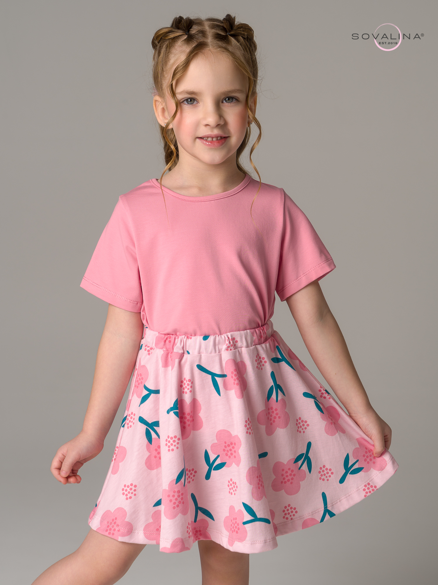 Летний трикотажный комплект для девочки ТМ SOVAlina. В костюм входит свободная футболка и широкая юбка. Отсутствие молнии и пуговиц позволит ребенку самостоятельно переодеваться. Расклешенная юбка и футболка пошиты из легкого, приятного наощупь полотна кулирной глади, материала из хлопка, в пояс юбки вшита резинка. Ткань гипоаллергенная и обладает отличной воздухопроницаемостью, благодаря чему дарит комфорт в жаркую погоду. Элементы костюма можно носить как вместе, так и по отдельности. Красивый хлопковый комплект одежды девочка сможет надеть летом на пляж, на прогулки, дома в отопительный сезон. Повод может быть любой: повседневный на каждый день, в детский сад или на дачу. Яркий, нежный принт не оставит равнодушными маленьких принцесс. Обращаем Ваше внимание, фото выполнено при студийном освещении, при естественном свете цвета могут иметь другие оттенки.