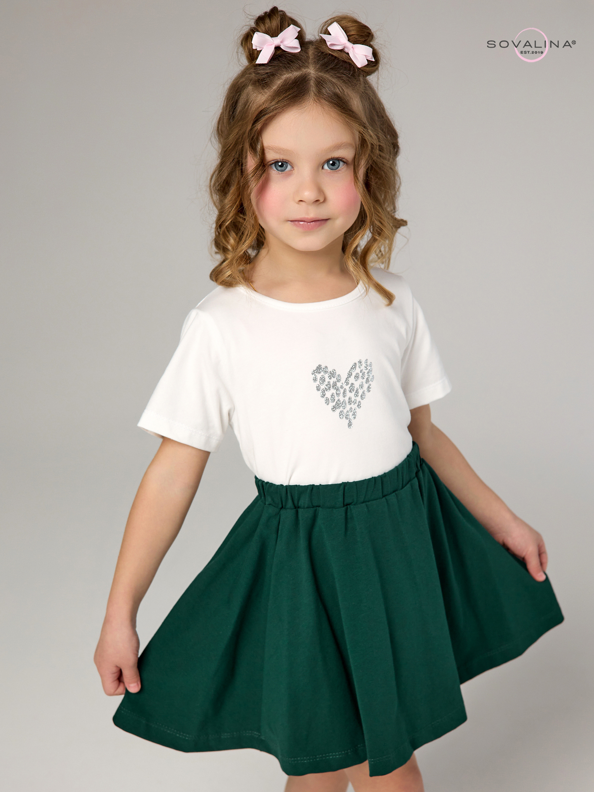 Летний трикотажный комплект для девочки ТМ SOVAlina. В костюм входит свободная футболка и широкая юбка. Отсутствие молнии и пуговиц позволит ребенку самостоятельно переодеваться. Расклешенная юбка и футболка пошиты из легкого, приятного наощупь полотна кулирной глади, материала из хлопка. В пояс юбки вшита резинка. Ткань гипоаллергенная и обладает отличной воздухопроницаемостью, благодаря чему дарит комфорт в жаркую погоду. Элементы костюма можно носить как вместе, так и по отдельности. Красивый хлопковый комплект одежды девочка сможет надеть летом на пляж, на прогулки, дома в отопительный сезон. Повод может быть любой: повседневный на каждый день, в детский сад или на дачу. Яркий, нежный принт не оставит равнодушными маленьких принцесс. Обращаем Ваше внимание, фото выполнено при студийном освещении, при естественном свете цвета могут иметь другие оттенки.