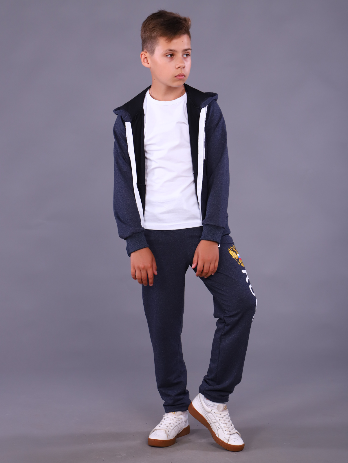 Спортивный костюм: кофта прямого кроя на молнии, боковые карманы, рукава с манжетами.
