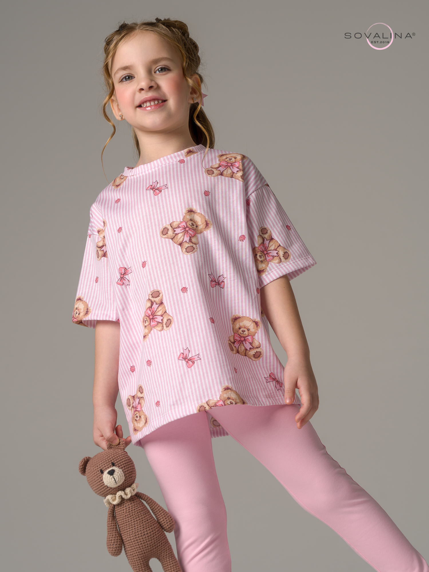 Яркий трикотажный костюм для девочки ТМ SOVAlina. Включает в себя оверсайз футболку и однотонные лосины на эластичной резинке, которая не давит на поясе. Облегченный дышащий материал высокого качества из тонкого хлопка, обеспечивает максимальный комфорт для ребенка. Детский легкий комплект двойка с коротким рукавом подойдет для летних и весенних прогулок. Нарядный и красивый костюмчик с леггинсами будет отличным выбором на утренники и повседневного посещения детского сада. Кофту и штаны можно носить как вместе так и по отдельности с другими вещами, создавая модные и стильные комплекты одежды на весну и прохладное лето.