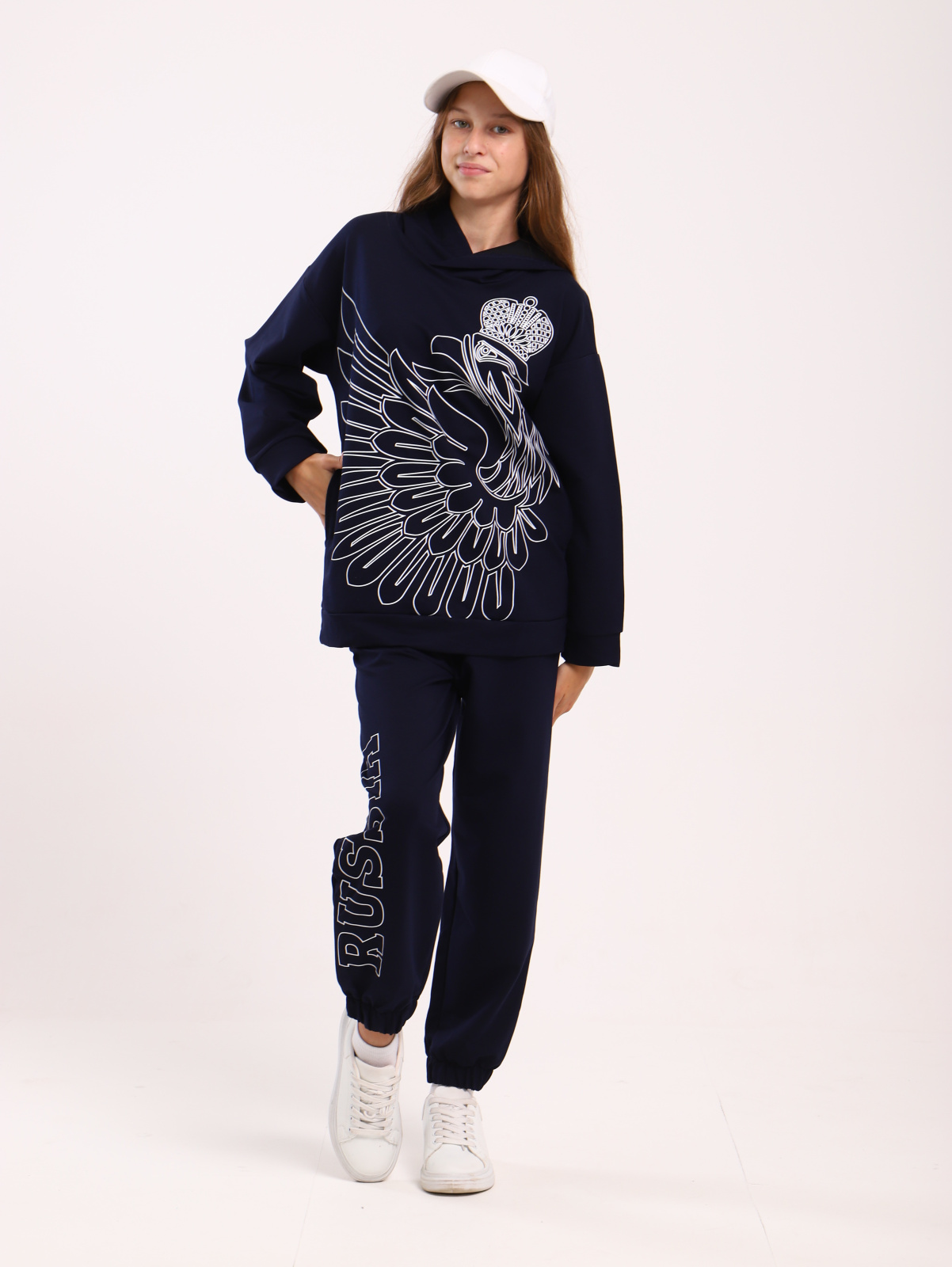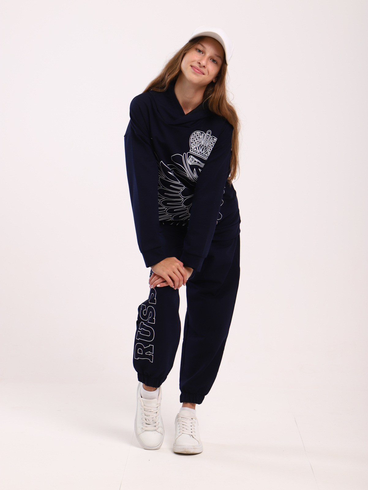 Наши спортивные костюмы - настоящий must have для повседневной моды, спорта и уроков физкультуры в школе для современных подростков. На молнии и с толстовкой худи, однотонные и с большим контурным принтом . Удобная толстовка свободного кроя ОВЕРСАЙЗ с капюшоном, со спущенной линией плеча, с карманами в боковых швах. Рукава с манжетами. На лицевой части крупный принт в виде крыла орла (символика России (РФ), в задней части вертикальная надпись «RUSSIA». Брюки модного широкого кроя с завышенной талией, но заниженной посадкой, пояс на удобной простроченной резинке с регулировочным шнуром, низ брюк на резинке. На правой ноге крупный принт «RUSSIA». Спортивный костюм выполнен из облегченного комфортного материала футера двухнитки с повышенным содержанием хлопка и лайкрой для удобства и эластичности. Изделия в комплекте могут использоваться как самостоятельные модные предметы одежды. Стильный трикотажный комплект двойка предназначен для современных и практичных юношей и девушек. Используется в повседневной жизни и для занятий спортом. Спортивный костюм облегченный без начеса является универсальным тренировочным костюмом, который подойдет не только для спорта и фитнеса в зале, но и для тренировок на улице. Это спортивная форма для занятий физкультурой будет незаменима для бега, для активных спортивных игр и соревнований. Форма для спортивных команд. В этом подростковом костюме комфортно в поездке на отдых или детский лагерь, подойдет в качестве школьной формы, будет комфортен для прогулок весной и осенью. В походе или прогулке костюм удобен, не стесняет движений. За счет сочетания хлопка с небольшим содержанием полиэстера трикотаж не теряет форму и не дает усадку после стирки, устойчив к износу и не скатывается. Комплект одежды двойка со штанами и худи.