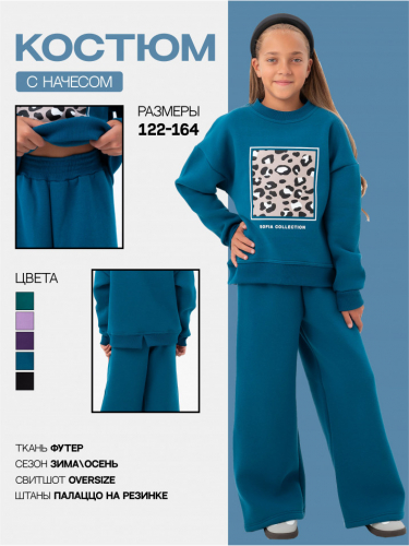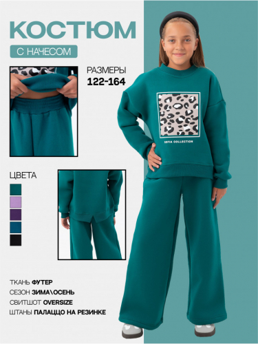 Теплый трикотажный костюм из футера с начесом для девочек. Спортивный костюм изготовлен из мягкого и приятного на ощупь материала на хлопковой основе производства Турция, обладает износостойкостью, не растягивается и не теряет своей формы. Начес может «сыпаться» или оставаться на одежде первые дни – это нормальное явление обусловленное технологией производства ткани, через пару стирок оно пройдет, что никак не скажется на теплоте и плотности костюма. Состоит из свитшота с принтом и штанов палаццо. Удобное лекало, не сковывающее движений, яркий принт, современный дизайн – подчеркнет индивидуальность и подарит комфорт. Кофта с модным леопардовым принтом закрывает поясницу и имеет декоративный разрез сзади. На брюках так же расположена стилизованная надпись, пояс на мягкой эластичной резинке. Отлично подойдет как детям, так и девочкам подросткам. Наш трендовый костюм - это отличный выбор для девочек, которые хотят быть яркими, модными, следят за модой и ведут активный образ жизни. Детский комплект двойка в стиле кэжел подходит для повседневного использования, прогулок, путешествий, походов в детский сад или школу, а также для особых случаев, таких как День Рождения, фотосессия, в гости, на праздник или в подарок. Флисовый детский костюм (костюм на флисе) в базовых расцветках обязательно полюбится вашим прекрасным девочкам и вам. Изумруд