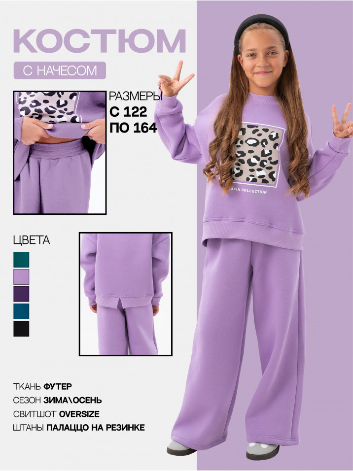 Теплый трикотажный костюм из футера с начесом для девочек. Спортивный костюм изготовлен из мягкого и приятного на ощупь материала на хлопковой основе производства Турция, обладает износостойкостью, не растягивается и не теряет своей формы. Начес может «сыпаться» или оставаться на одежде первые дни – это нормальное явление обусловленное технологией производства ткани, через пару стирок оно пройдет, что никак не скажется на теплоте и плотности костюма. Состоит из свитшота с принтом и штанов палаццо. Удобное лекало, не сковывающее движений, яркий принт, современный дизайн – подчеркнет индивидуальность и подарит комфорт. Кофта с модным леопардовым принтом закрывает поясницу и имеет декоративный разрез сзади. На брюках так же расположена стилизованная надпись, пояс на мягкой эластичной резинке. Отлично подойдет как детям, так и девочкам подросткам. Наш трендовый костюм - это отличный выбор для девочек, которые хотят быть яркими, модными, следят за модой и ведут активный образ жизни. Детский комплект двойка в стиле кэжел подходит для повседневного использования, прогулок, путешествий, походов в детский сад или школу, а также для особых случаев, таких как День Рождения, фотосессия, в гости, на праздник или в подарок. Флисовый детский костюм (костюм на флисе) в базовых расцветках обязательно полюбится вашим прекрасным девочкам и вам. Сиреневый