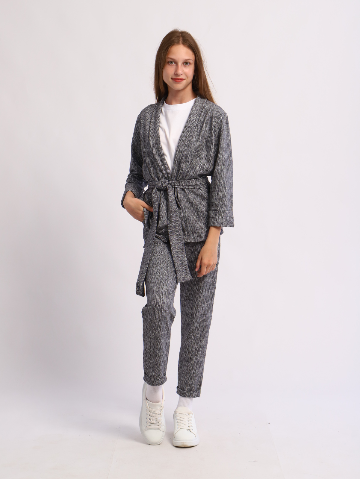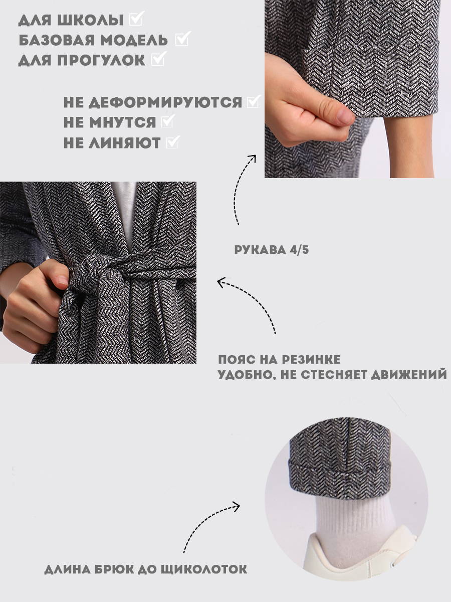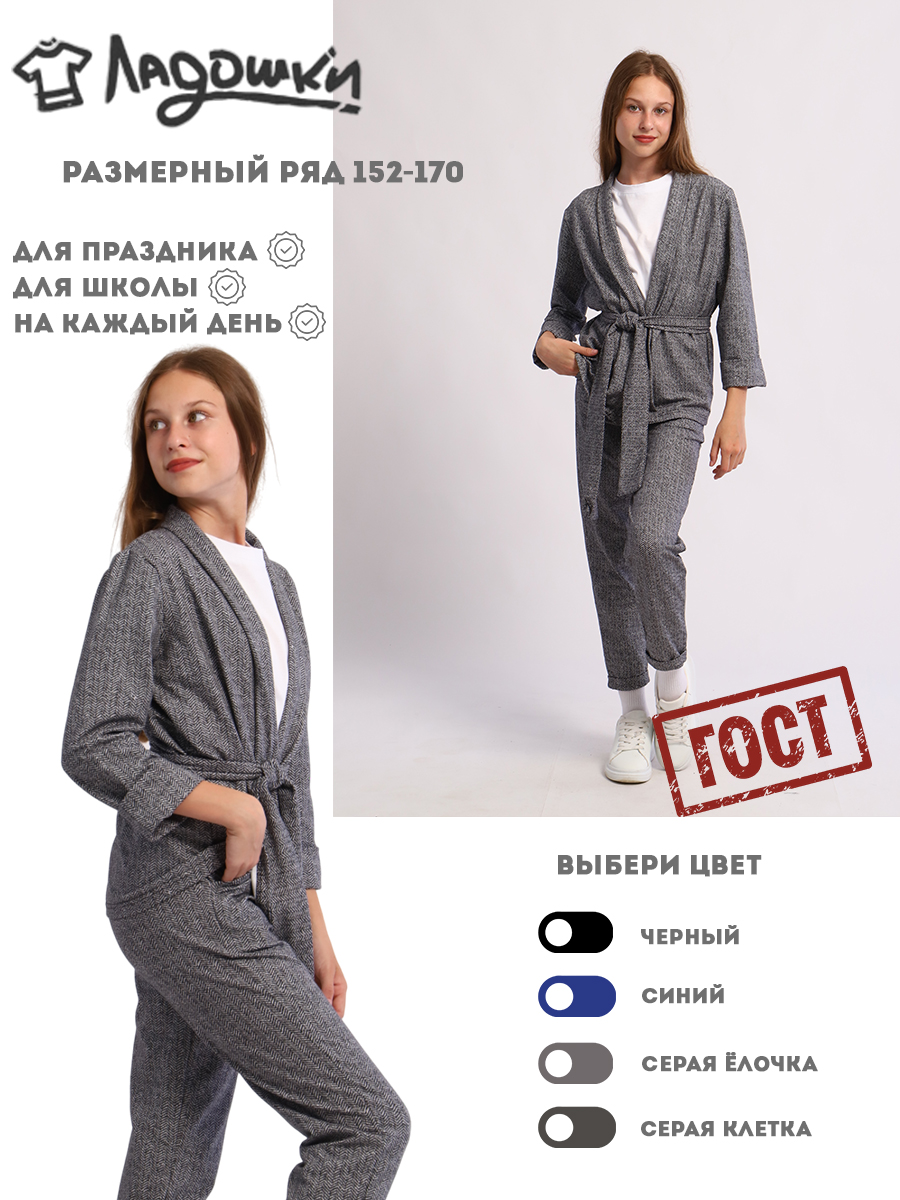 Трикотажный школьный костюм - двойка, который состоит из жакета с поясом кроя оверсайз и брюк на резинке прямого свободного кроя. Брюки с высокой и комфортной посадкой и эластичным поясом на резинке. Штаны длиной 7/8. в боковых швах - карманы. Женский пиджак прямого кроя с отворотом, длина рукава три четверти (3/4) с подгибом. Жакет фиксируется на талии элегантным поясом.