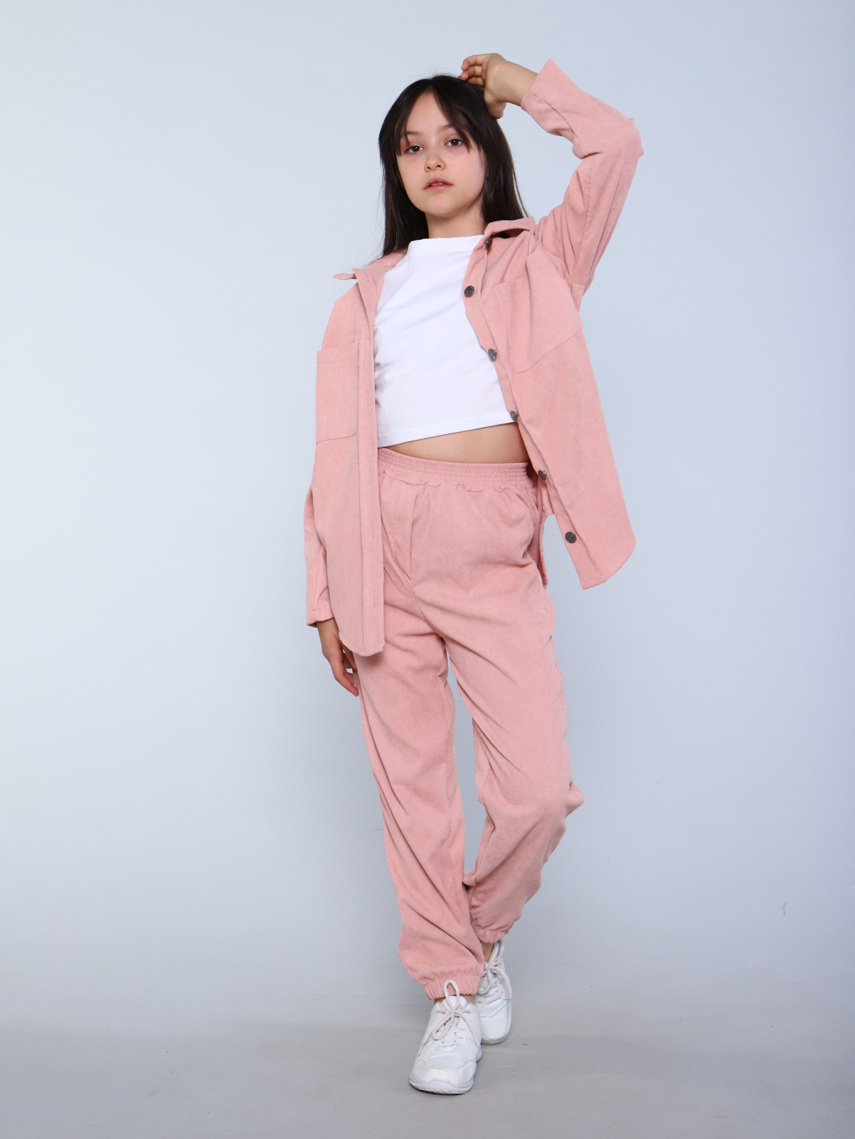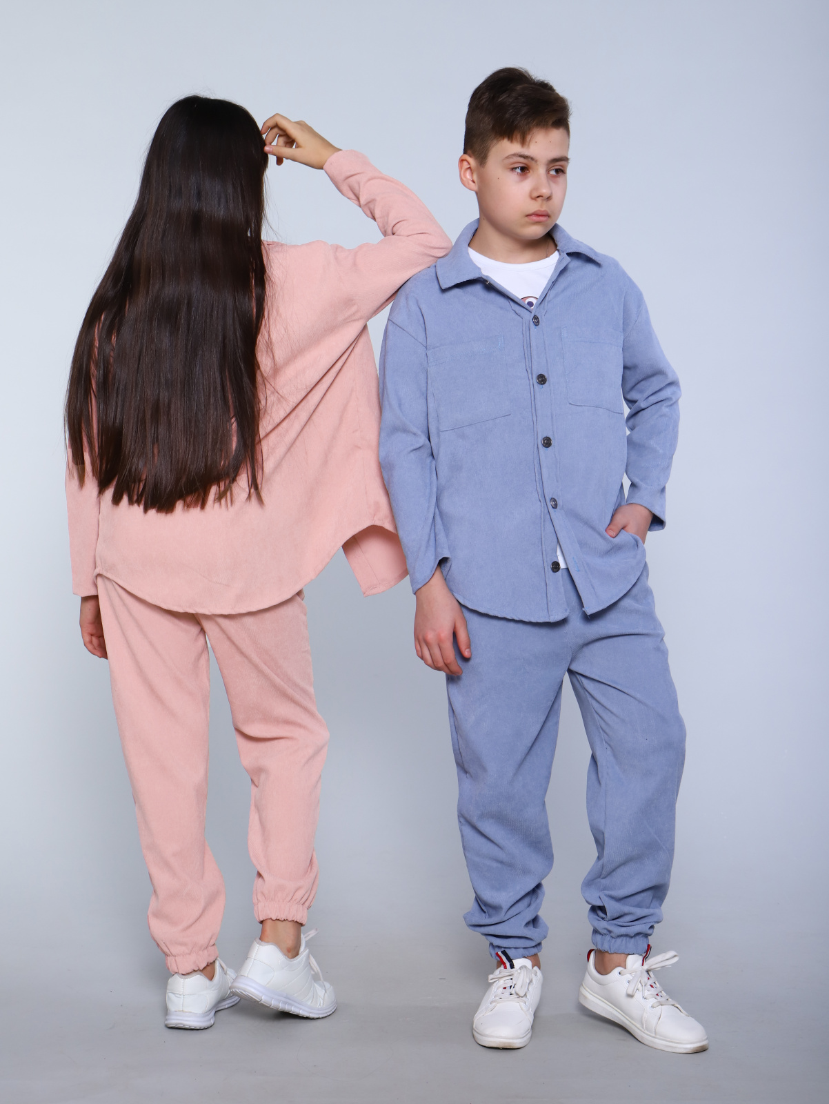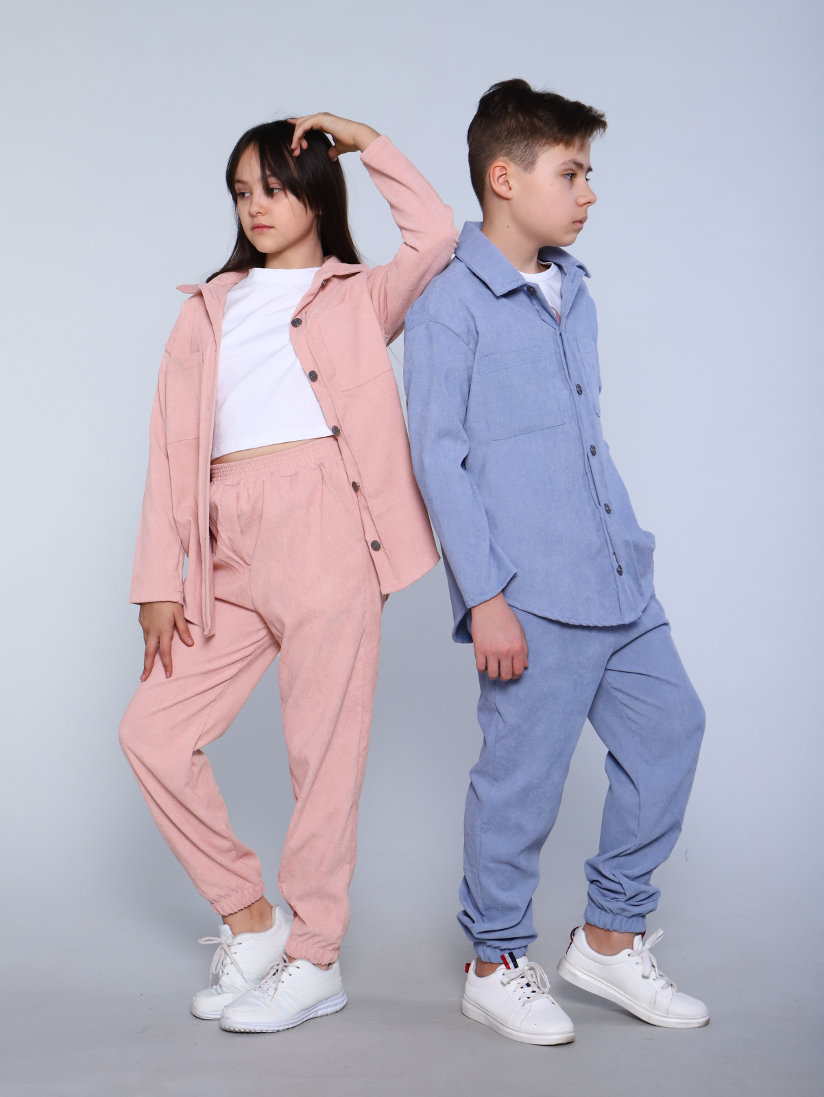 Модный подростковый вельветовый костюм в монохромной гамме для мальчиков и девочек средней и старшей школы. Этот повседневный детский костюм сшит из мягкой комфортной вельветовой ткани в мелкий рубчик. Стильный комплект в стиле спортшик состоит из джоггеров спортивного кроя и рубашки модного стиля оверсайз (oversize) с нагрудными карманами. Рубашка большого объемного силуэта так любимого подростками и молодежью, низ полукруглой формы, вместительные карманы на груди, удобный мягкий ворот, красивые металлические пуговицы на планке. Брюки-джоггеры свободного силуэта с поясом на резинке, низ брюк оформлен на резинке, боковые отрезные кармашки. Костюм подходит для весенних прогулок , прохладных летних вечеров, комфортен в любое время в помещении. Рубашка и брюки отлично используются как самостоятельные изделия для комплектования интересных образов. Костюмчик-двойка подходит для школы, повседневной носки, а также в качестве нарядного комплекта. Костюм двойка брюки и рубашка оверсайз детский подростковый однотонный повседневный для школы на мальчика и на девочку вельветовый в рубчик в пастельных тонах размер 140 146 152 158 164 170.