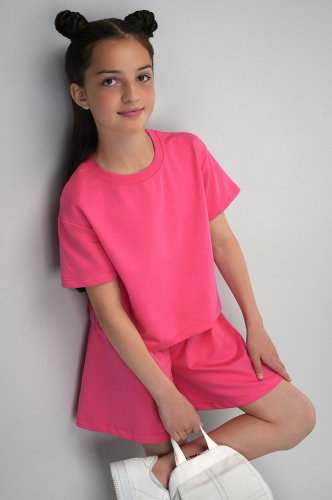 Добавление лайкры в состав трикотажа дарит идеальную посадку и полную свободу движений. Однотонный детский костюм со штанами – прекрасный вариант для дома на каждый день. Короткий рукав с отворотом и спущенной линией плеча придаёт образу расслабленный, но аккуратный вид. Широкие брюки дополнены мягкой эластичной резинкой, которая нежно прилегает к телу.