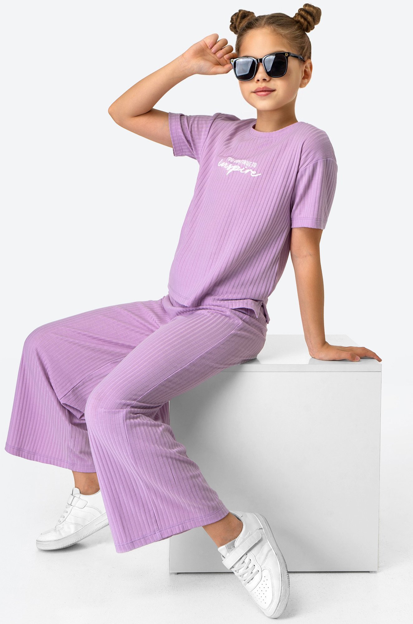 Летний костюм в рубчик для девочки и девочки подростка выполнен из фактурной ткани лапша. Трикотаж – легкий и дышащий, в нем будет комфортно даже в самый жаркий день. Детский костюм с брюками отлично держит форму, не вытягивается в коленях, а лавандовый цвет сохраняет яркость даже после многочисленных стирок.