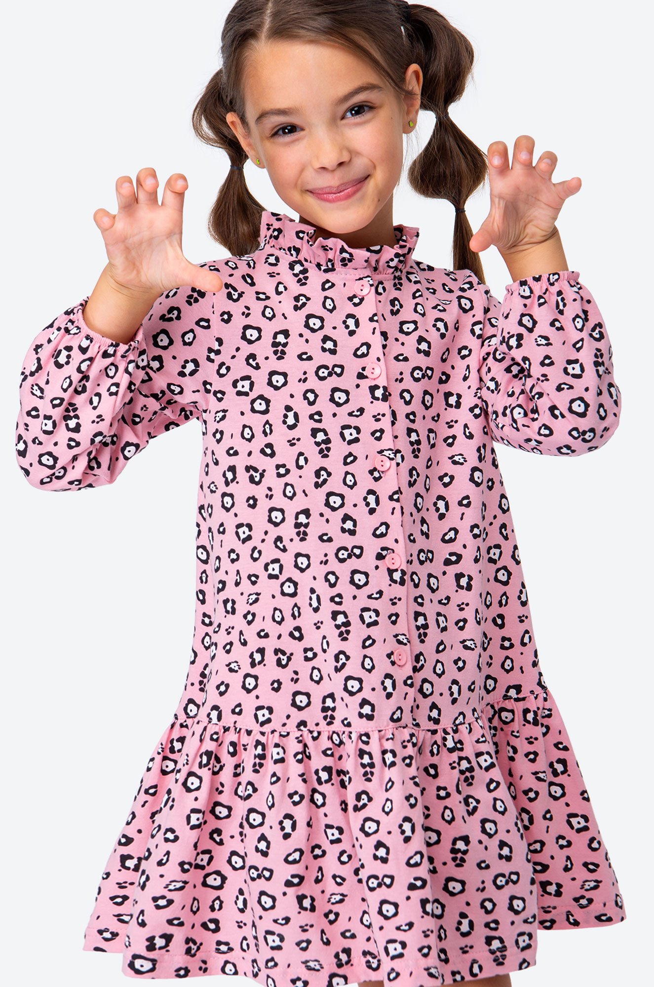 Детское розовое платье для девочки выполнено из натурального 100% хлопка. Свободный крой, длинный рукав, удобная застежка на пуговицы – каждая деталь создана для комфорта ребенка. Благодаря трендовому леопардовому принту, кокетливому воротнику-стойке и воздушным сборкам на юбке девочка будет чувствовать себя принцессой в любой ситуации.