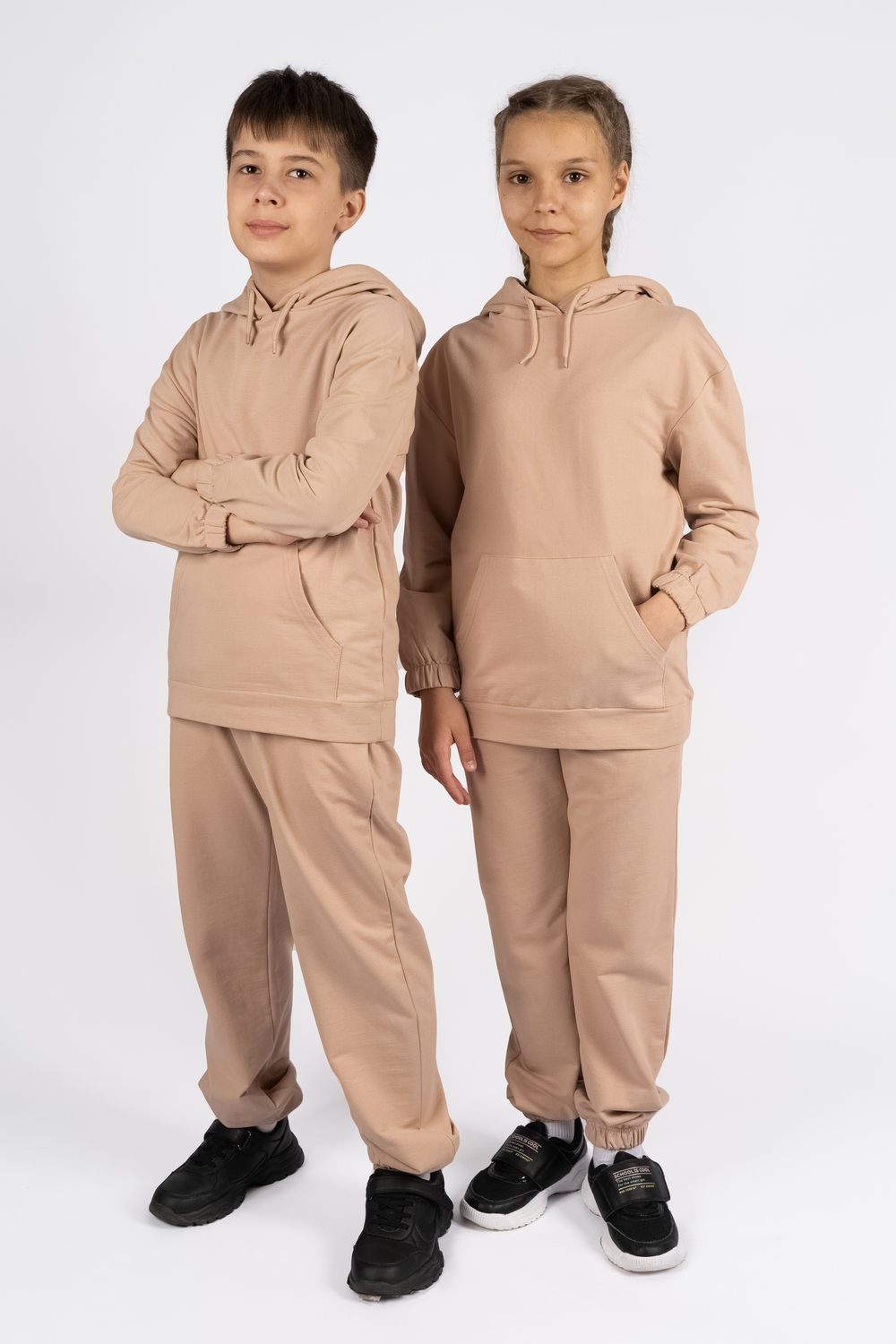 Мягкий хлопковый джемпер - универсальная вещь в гардеробе каждого ребенка. Отлично садится по фигуре и не теряет цвет после многочисленных стирок. Толстовка прямого силуэта со спущенным длинным рукавом. Горловина круглая с капюшоном. Капюшон состоит из 2 половин. Горловина спинки внутри обработана настрочной планкой из киперной ленты. С изнанки капюшона выполнен подклад из кулирки. По переднему срезу капюшона для утяжки вставлен утягивающий круглый канатный шнурок. Для выхода шнурка предусмотрены пробивные петли. Рукав заканчивается манжетой из основного полотна. По низу изделия пояс из основного полотна. На полочке расположен карман кенгуру. Цвет: хаки;черный;графит;капучино; Материал: футер 2-х нитка;футер 2-х нитка; Состав: 100% хлопок.