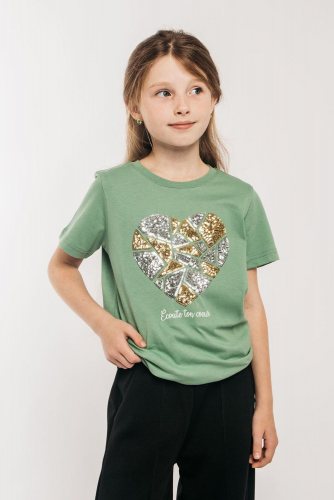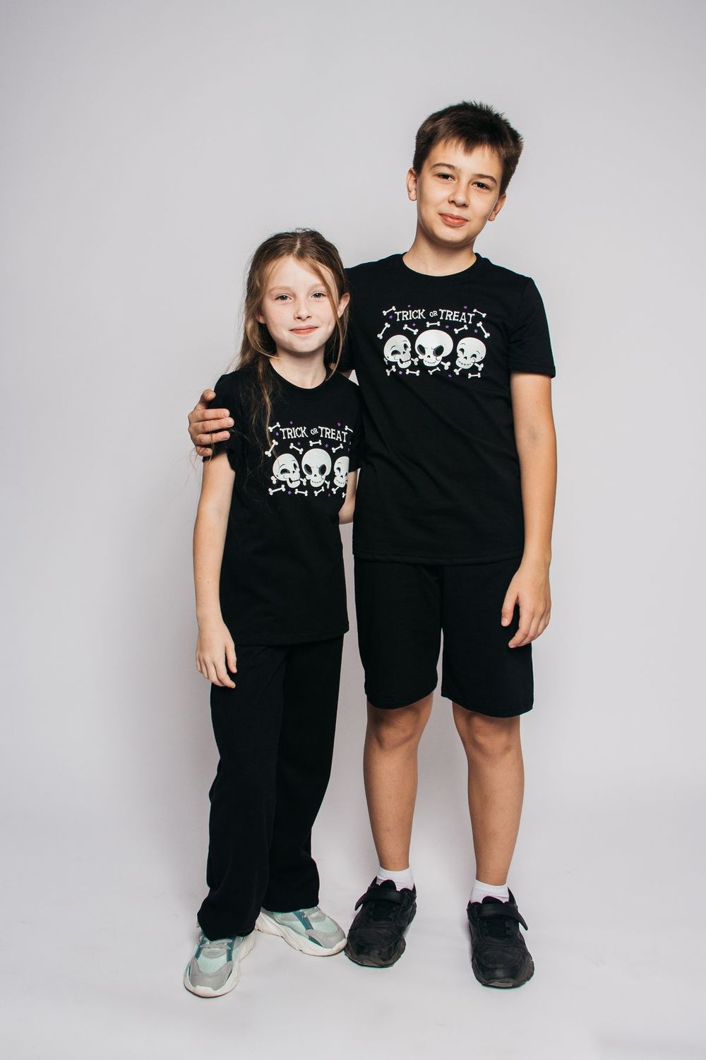 Футболка детская прямого силуэта с в тачным коротким рукавом. Горловина круглая обработана воротником из рибаны в цвет изделия. Низ изделия и рукавов обработан швом в подгибку. На полочке флуоресцентный принт.