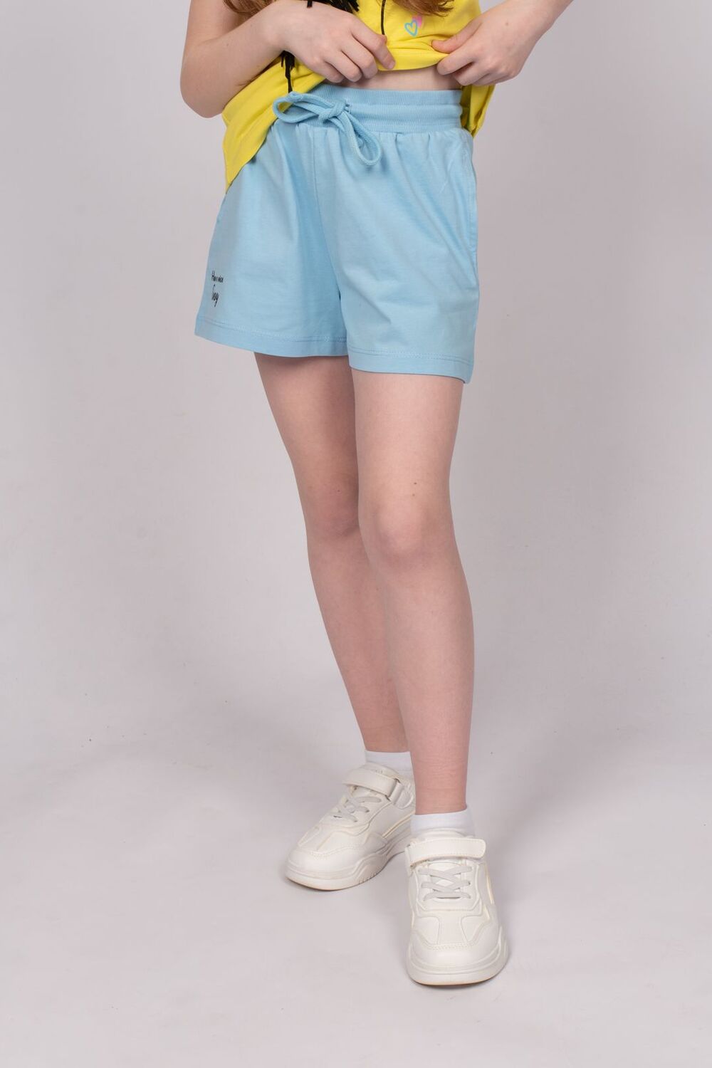 Шорты для девочки прямого силуэта из кулирки. Пояс отрезной в цвет изделия, выполнен из кашкорсе. По поясу шорт вставлен плоский утягивающий шнурок в цвет шорт, низ шнурка подвернут и застрочен. Вдоль пояса шнурок закреплен отстрочкой. В боковых швах выполнены карманы с листочкой. Низ изделия обработан швом в подгибку. На правой передней половинке шорт принт шелкография. Надпись переводится как Милая ромашка.