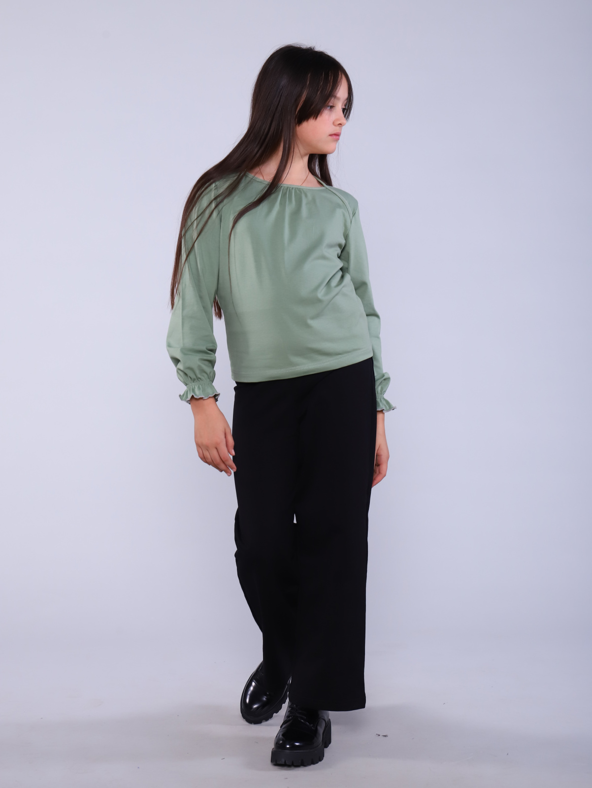 Детская кофта свободного кроя, с круглой горловиной со сборкой, рукава с декоративными сборками по низу.