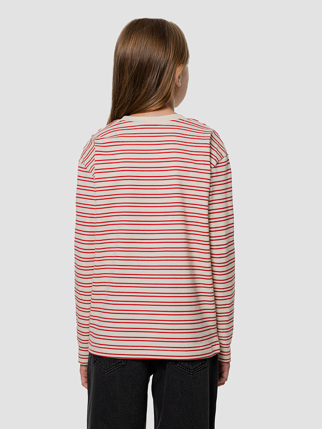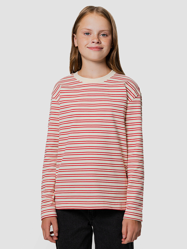 Лонгслив для девочек выполнен в прямом силуэте, что делает его универсальным и комфортным для повседневной носки. Округлая горловина выполнена из рибаны — эластичного материала, который хорошо сохраняет форму и мягко прилегает к телу. Шов втачивания горловины аккуратно закрыт бейкой из основного материала, добавляя изделию эстетики и долговечности. Спущенное плечо и длинные рукава создают расслабленный и актуальный образ, идеально подходящий как для школы, так и для прогулок. Низ рукавов и самого изделия аккуратно обработан швом вподгибку, что сохраняет форму после многочисленных стирок. Лаконичный и практичный дизайн позволяет легко комбинировать лонгслив с различными элементами гардероба — от джинсов до юбок.