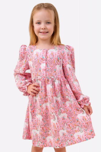 Легкое детское платье с длинным рукавом-фонариком для девочки сшито из натурального гипоаллергенного 100% хлопкового трикотажа. Нарядное розовое платье украшено милым принтом Единороги. Кокетливые рюши на манжетах и сборки на талии добавляют образу воздушности и нежности.