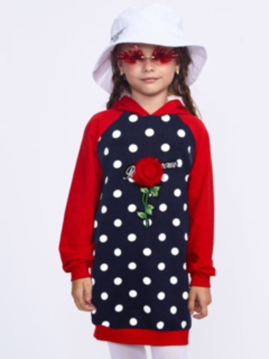 Платье прямого кроя с капюшоном, длинные рукава, манжеты и низ из трикотажного полотна.