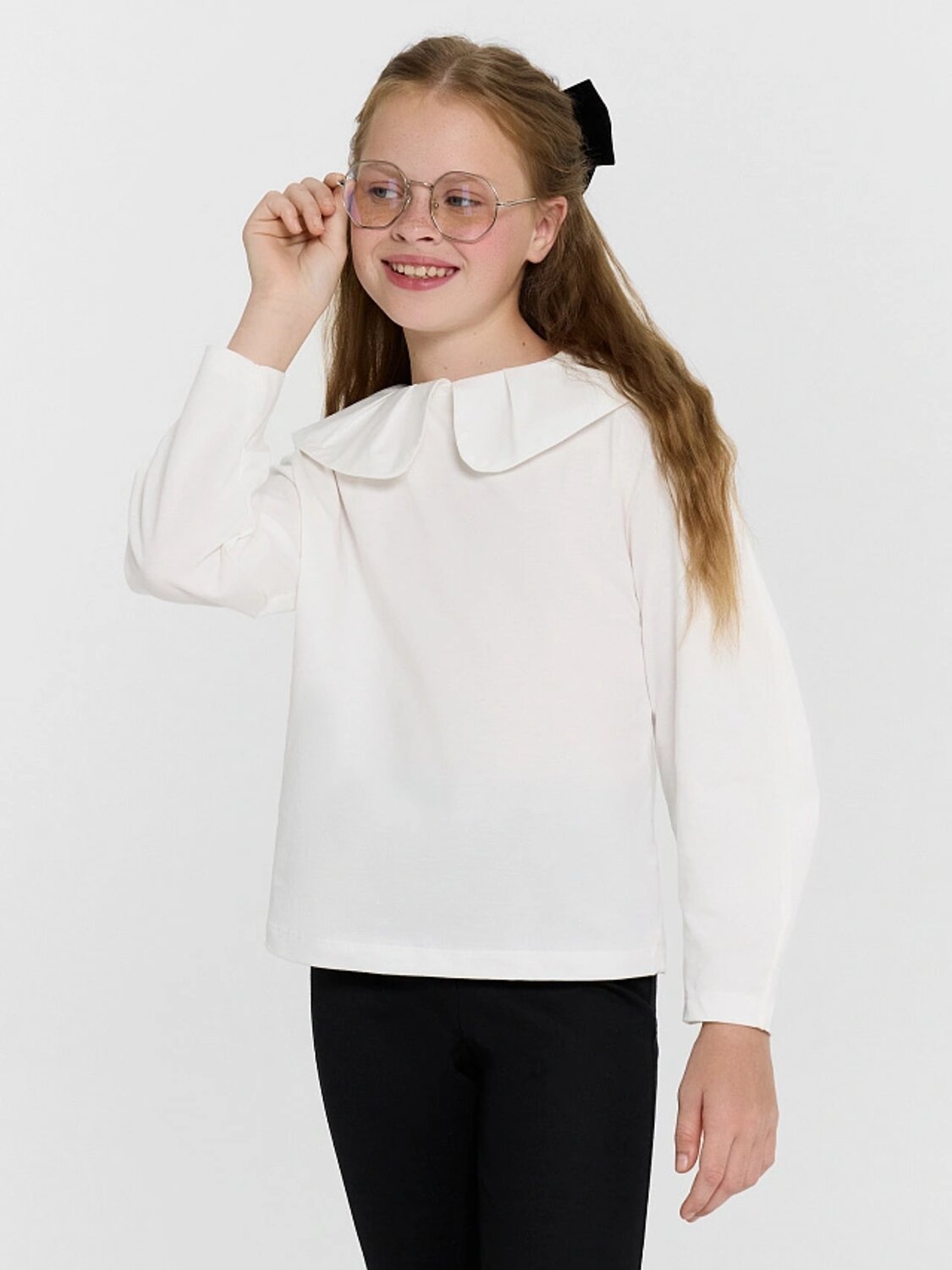 Блузка свободного силуэта. Рукава длинные втачные, с двумя швами. Горловина круглой формы с воротником из поплина. . Сзади изделия застежка - «капелька» на пуговицу d=10mm, петлю жилка вязаная 4 мм,жилка 13797K,KT1-4 . Низ рукавов и изделия обработаны на 2-х игольной плоскошовной машине швом в подгибку.