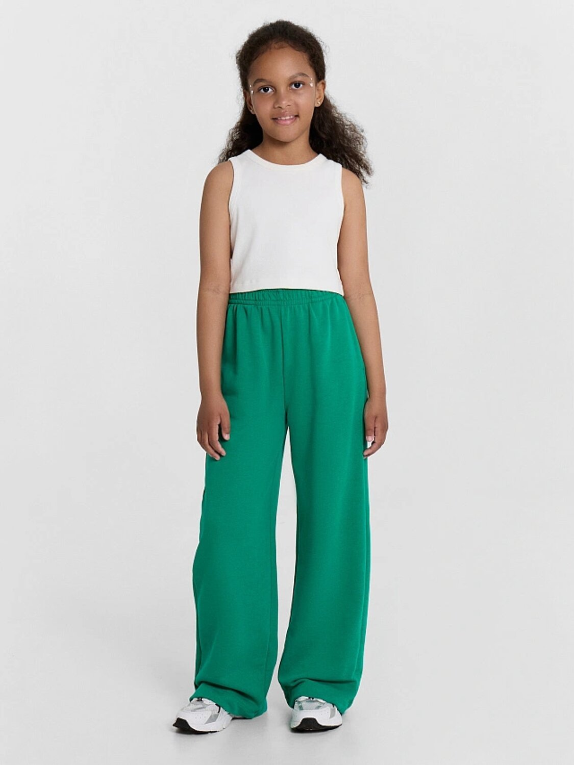 Брюки для девочек, прямого силуэта. Пояс цельнокроеный с втачной эластичной тесьмой RV40. Пояс прострочен двумя отделочными строчками. По переду обработаны карманы в швах. Низ брюк обработан швом в подгибку на двухигольной плоскошовной машине.