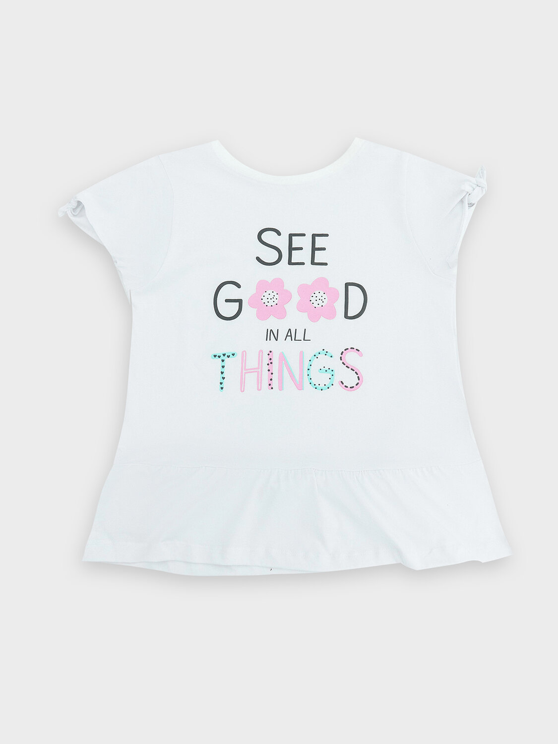 Перед и спинка с отрезной рюшей по низу. Горловина круглой формы. Обработана