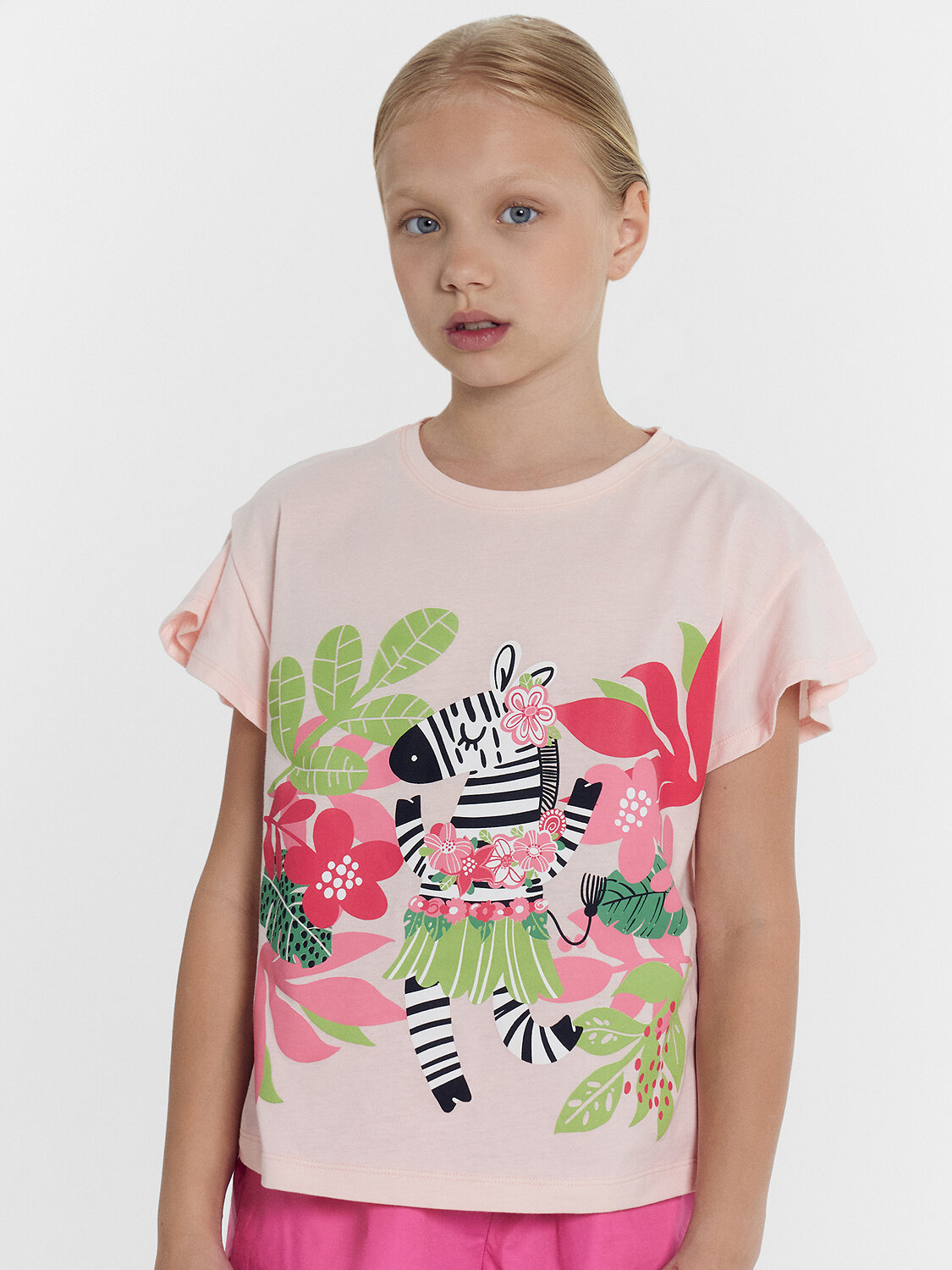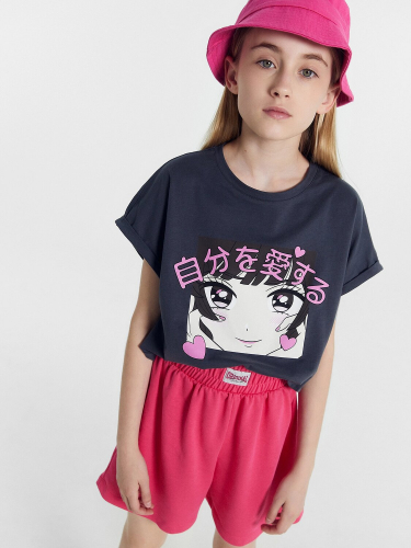 Необычная футболка для девочек, созданная из трикотажной кулирки. Силуэт прямой, длина до середины ягодиц. Горловина круглой формы. Спущенная линия плеча и углубленная пройма дарят особый комфорт, а короткие рукава в виде рюши делают футболку привлекательной.