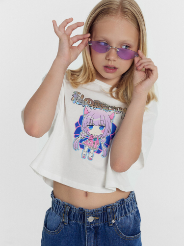 Укороченная футболка свободного силуэта из трикотажной кулирки. Пройма спущена, что дарит свободу движений. Рукава короткие. Горловина круглой формы. Идеально для шортиков или брюк с высокой посадкой!