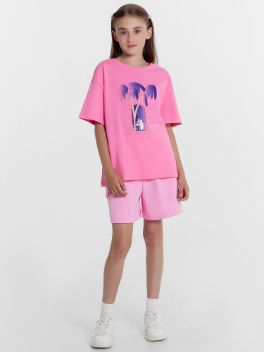 Футболка свободного силуэта. Перед и спинка футболки цельнокроеные. Рукава короткие втачные. Линия плеча спущена. Горловина круглой формы, обтачка из трикотажного полотна рибаны. Шов втачивания рибаны по спинке закрыт бейкой из основного полотна. Низ футболки и рукавов обработан швом в подгибку.