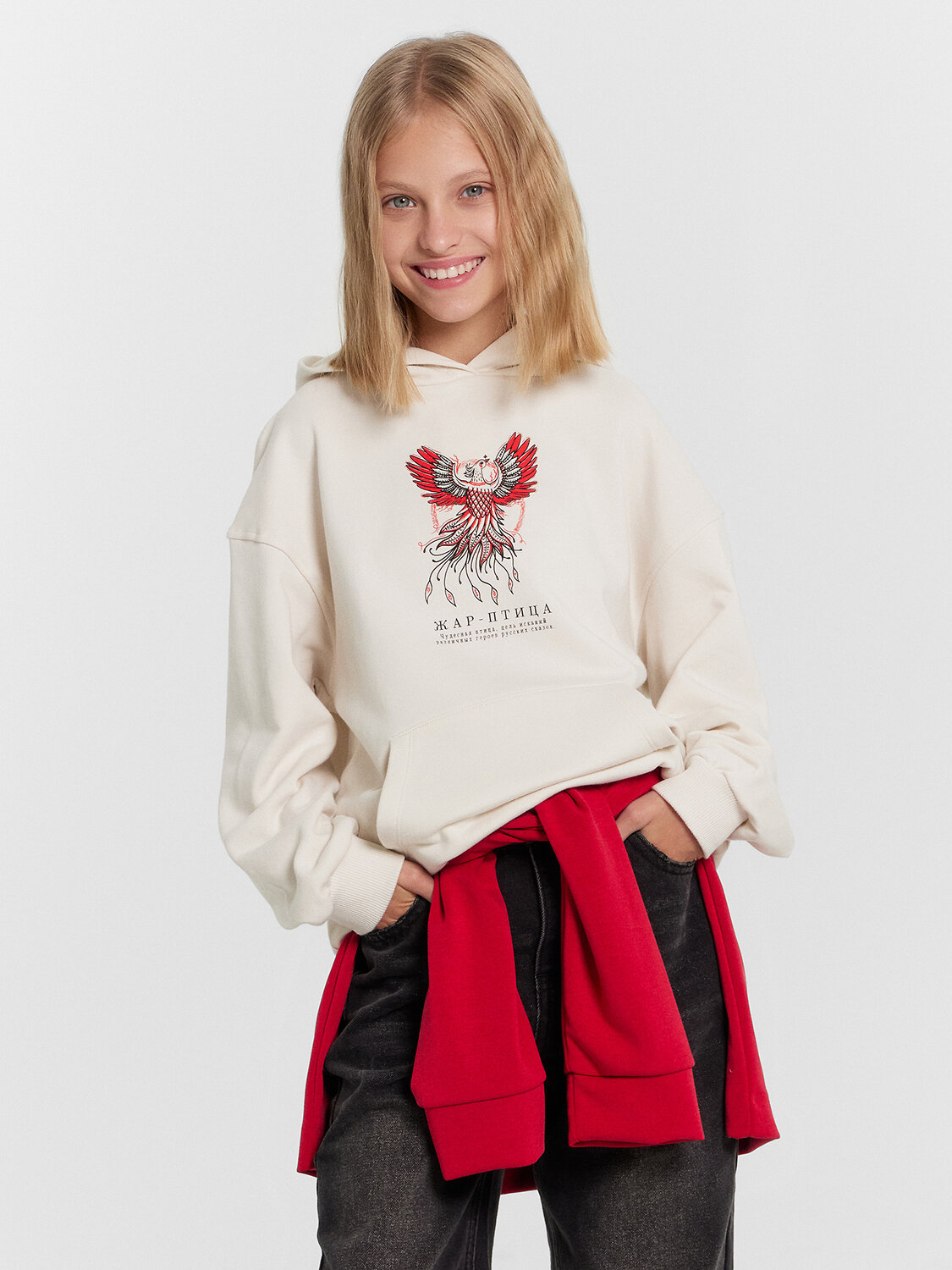 Худи для девочек, свободного силуэта (оверсайз), с капюшоном. Горловина округлой формы. Капюшон со средним швом, на подкладке из основного полотна. Шов втачивания капюшона закрыт хб тесьмой. Плечо спущено, рукав втачной длинный. По низу рукава отрезная манжета из рибаны. Пояс отрезной из рибаны, отстрочен. По переду карман кенгуру.