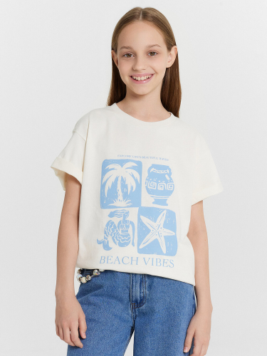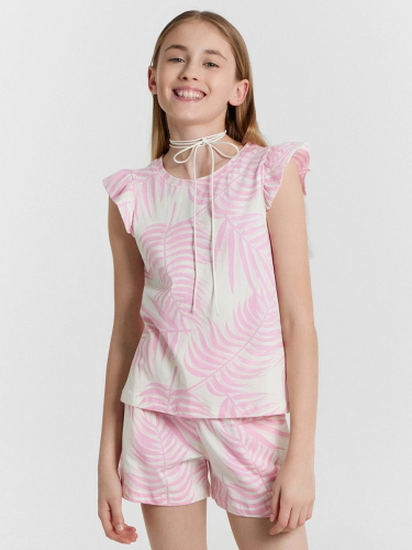 Легкий и привлекательный комплект из трикотажной кулирки. Включает необычную футболку и мини-шорты. Футболка прямого силуэта, длиной до середины ягодиц, с круглой горловиной и необычными короткими рукавами, украшенными рюшами. Шорты короткие, с боковыми карманами и эластичной резиной в поясе. наверняка понравится вашей девочке!