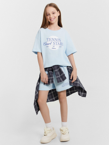 Стильный комплект для девочек. Выполнен из трикотажного футера. Состоит из футболки и шортов. Футболка свободного силуэта длиной до середины бедра, с короткими рукавами и круглой горловиной. Шорты длиной немного выше колен, с эластичной резиной в поясе и регулировочным шнуром. Прекрасный выбор!