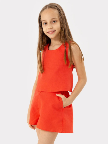 Комплект состоит из топа и шорт. Топ А-силуэта. Перед и спинка цельнокроеные. Круглый вырез горловины. Обтачка горловины и пройм из основного полотна. Низ топа обработан швом в подгибку сзакрытым срезом.