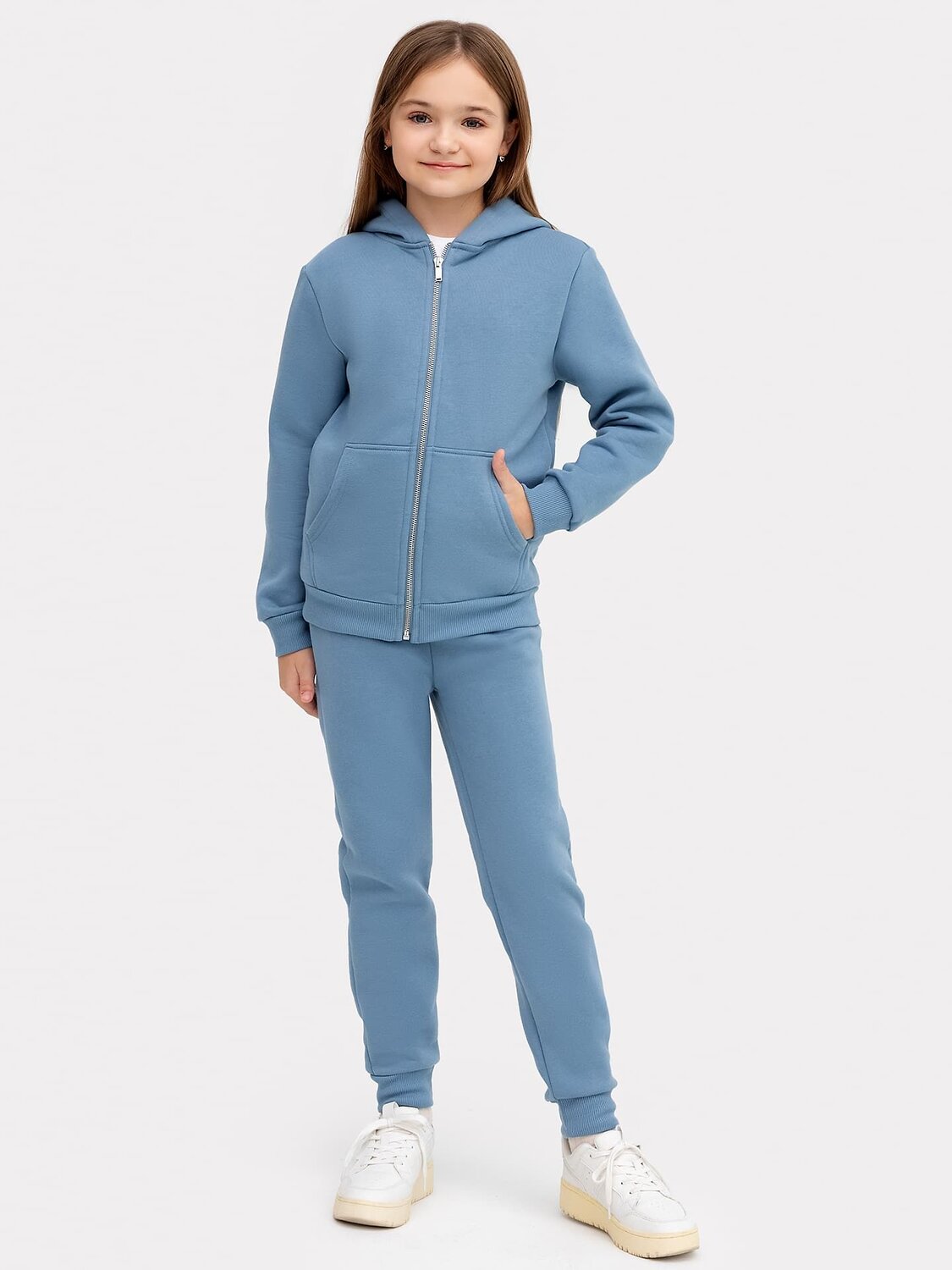 Комплект из трикотажного футера без подчеса. Жакет прямого силуэта с застежкой на молнию, уютным капюшоном, длинными рукавами, немного спущенной линией плеча, манжетами и поясом из рибаны. Брюки прямого силуэта, с резинкой и регулировочным шнурком в поясе. Универсальный комплект для вашей девочки!