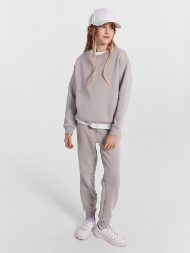 Комплект из трикотажного футера с нежным и теплым подчесом. Джемпер свободного силуэта, со углубленной проймой, длинными рукавами на манжетах и круглой горловиной. Брюки средней посадки, прямые, слегка зауженые к низу, с регулировочным шнурком в поясе. Отличный выбор для прохладной погоды!