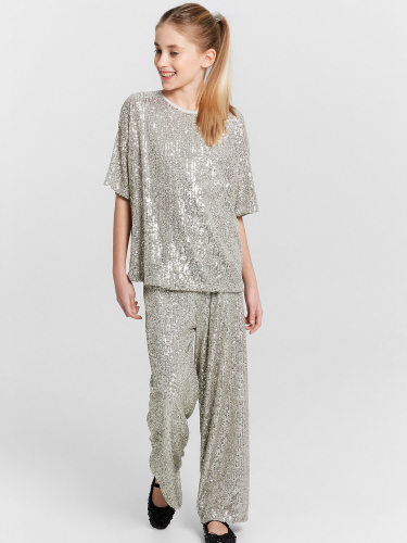Джемпер свободного силуэта. Горловина круглой формы, обтачка горловины из рибаны. Плечо спущено, пройма углублена. Рукав втачной, длинный. По низу рукава отрезные манжеты из рибаны.