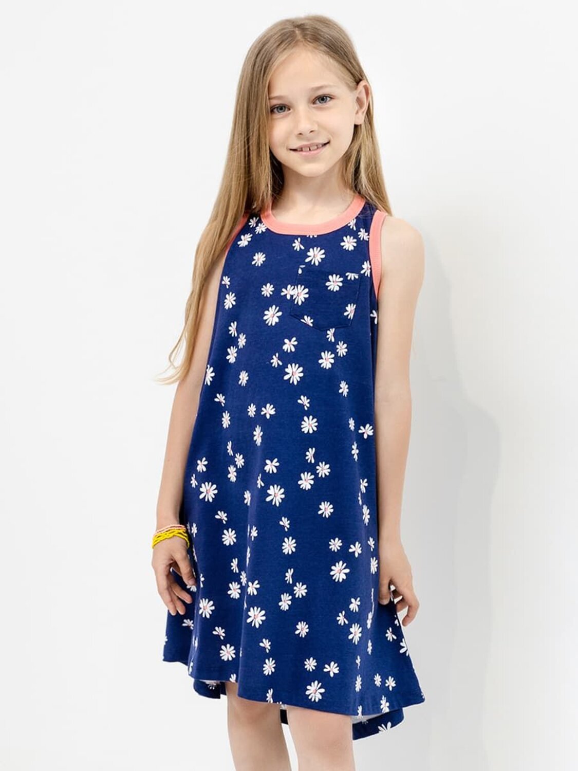 Платье для дечовек. Создано из трикотажной кулирки. Длина до колен, А-образный силуэт. Округлый вырез горловины, со сборочками. Рукава короткие, реглан. Украшением платья является миниатюрный нагрудный карманчик. Отличный выбор!