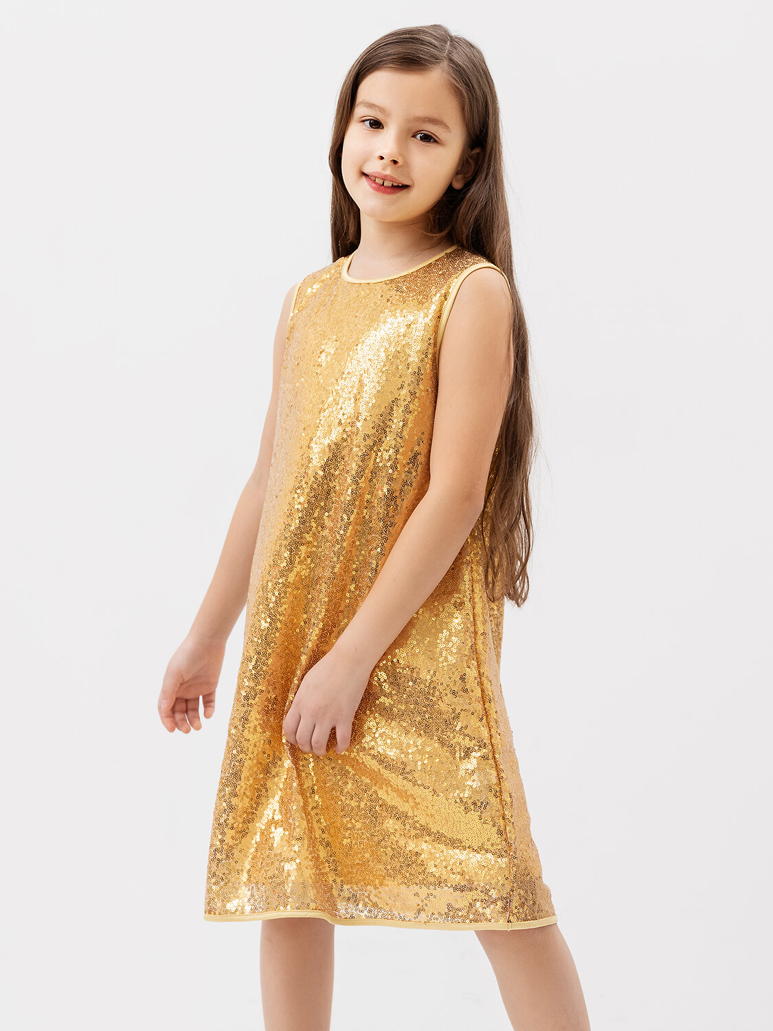 Платье А-силуэта без рукавов. Подкладка переда и спинки из кулирного полотна. Верхняя часть платья - пайетки. Горловина круглая. По спинке застежка-капелька на пуговицу. Горловина, проймы и низ изделия оконтованы.