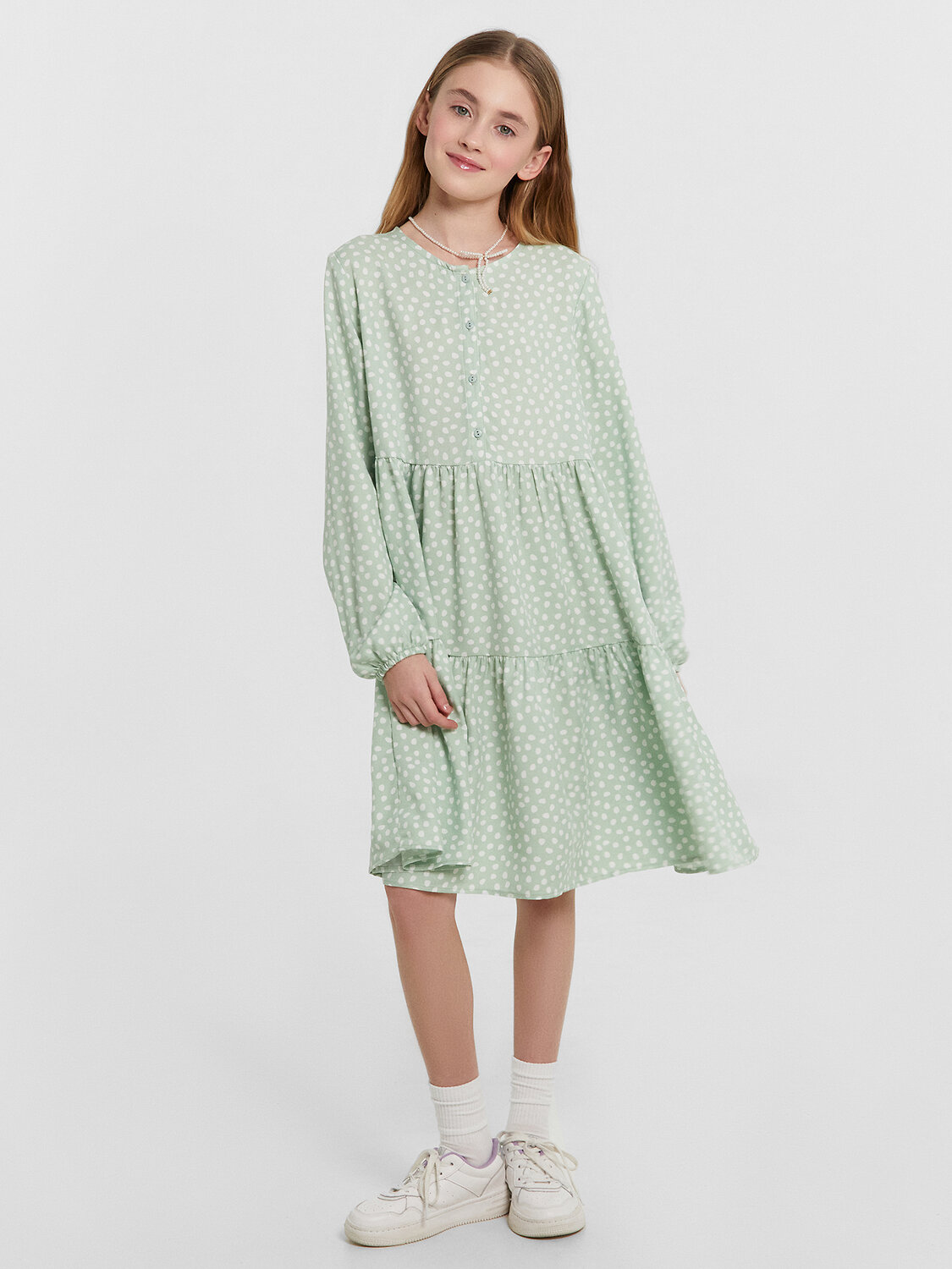 Красивое детское платье для девочек в классическом А-силуэте с отрезными воланами. Эта модель из 100% вискозы сочетает в себе изящество и шарм, создавая идеальную гармонию стиля. По переду платья расположена застежка-планка, состоящая из четырех элегантных пуговиц. Горловина платья выполнена в форме круглого выреза. Длинные втачные рукава придают платью элегантность и изысканность. Такое платье станет идеальным выбором на каждый день и для праздников. Оно подчеркнет индивидуальность вашей девочки, а его оригинальный дизайн не оставит равнодушными окружающих. Рекомендуем!