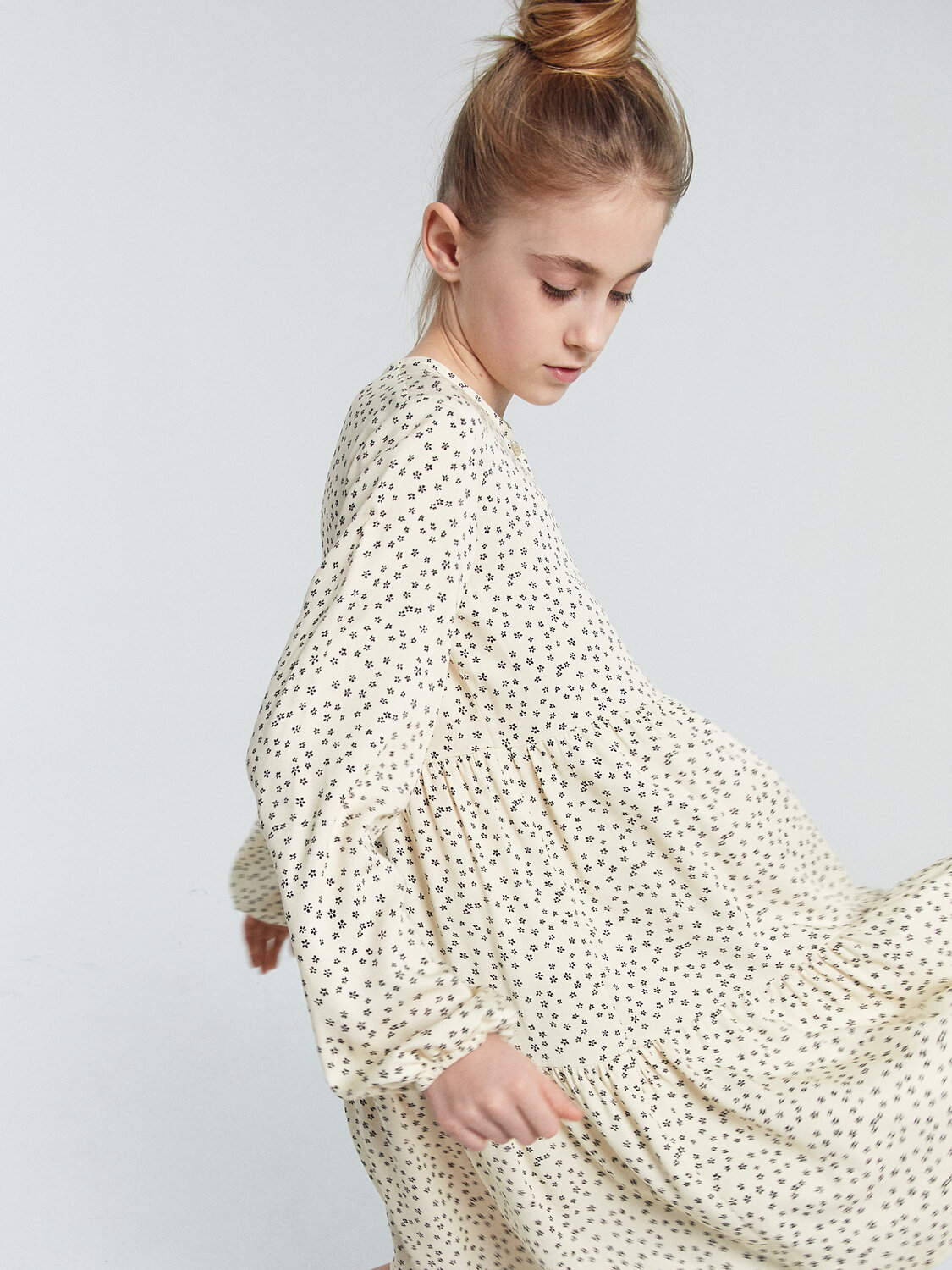 Платье А-силуэта с отрезными воланами. По переду застежка - планка на 4 пуговицы. Горловина круглая обработана бейкой в чистый край. Рукав длинный втачной. По низу рукавов внутрь застрочена эластичная тесьма.