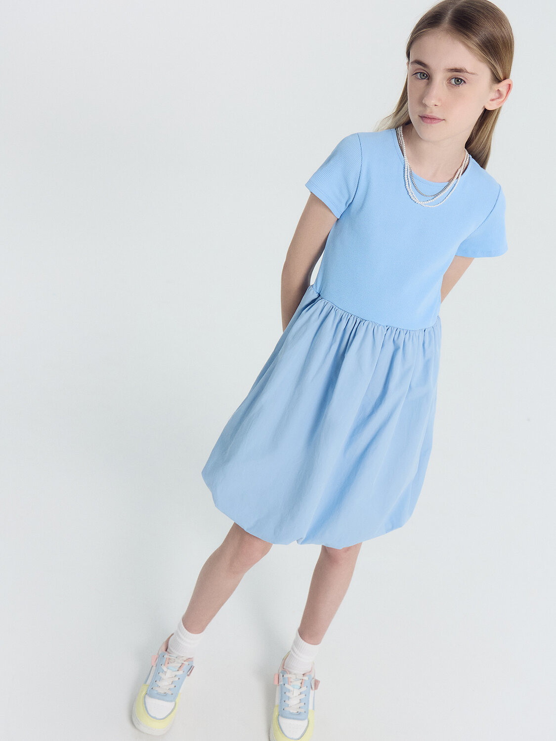 Платье полуприлегающего силуэта с отрезной линией талии. Верх платья из полотна трикотажного рибаны 2*2. Рукава втачные короткие. Круглый вырез горловины. Горловина обработана бейкой в чистый край. Юбка балон выполнена из ткани с подкладкой из трикотажного кулирного полотна.