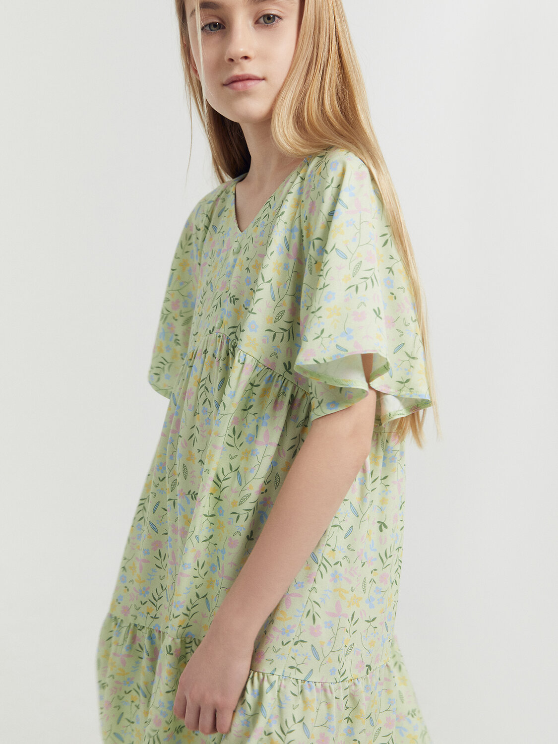 Легкое детское платье А-силуэта с отрезными воланами для девочек. Треугольный вырез горловины. Короткие рукава-крылышки покроя реглан. Низ лифа фигурный. По переду лифа пришиты три пуговицы в качестве декора. Материал очень приятный к телу, хорошо пропускает воздух, что позволяет чувствовать комфорт даже в жаркую погоду. Мягкое, слегка эластичное, комфортно сидит по фигуре, не стесняет движений. Представлено в широком размерном ряду и цветовой палитре. Модное и невероятно красивое. Подходит для девочек на каждый день в теплое время года. Рекомендуем!