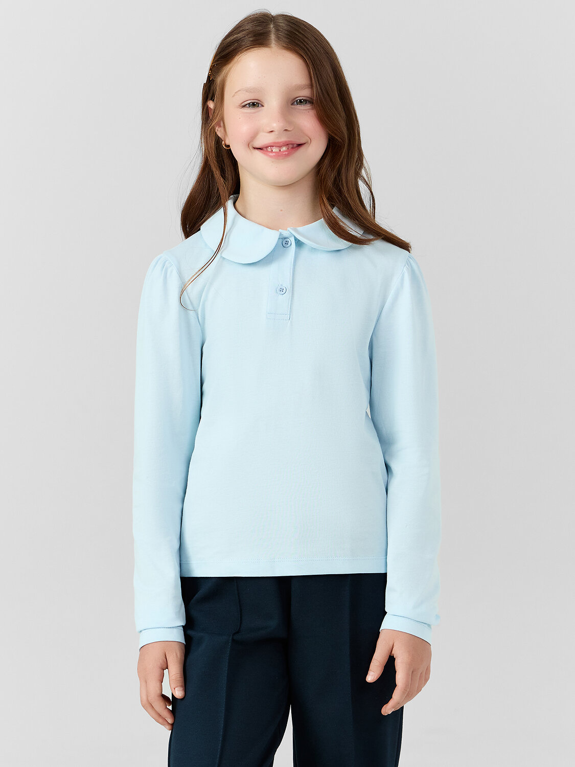 Лаконичное поло для девочек — стильное и удобное решение на каждый день! Полуприлегающий силуэт обеспечивает комфортную посадку, сохраняя свободу движений и аккуратный внешний вид. Длинные рукава делают модель универсальной, позволяя носить ее в разные сезоны и создавая уютное ощущение. Отложной воротник придает классический и элегантный акцент, а застежка «поло» на две петли и пуговицы добавляет удобства и стильной завершенности. Изделие выполнено из хлопковой кулирки — мягкого, дышащего и приятного к телу материала, который обеспечивает комфорт в течение дня и хорошо сохраняет форму даже после многочисленных стирок. Отличный вариант для повседневного гардероба!