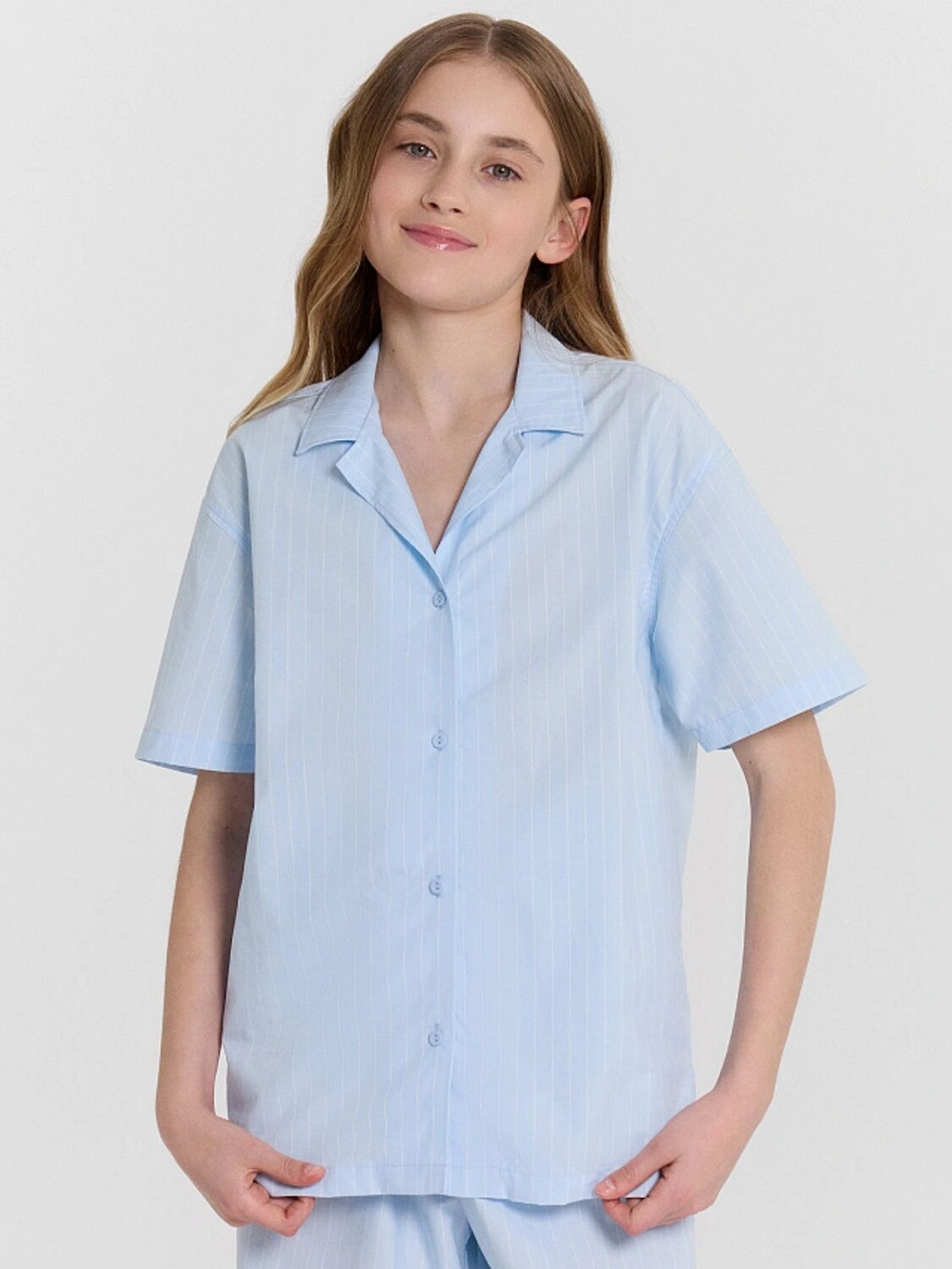 Блузка для девочек. свободного силуэта из ткани. По переду обработана застежка на пуговицы d=10mm и петли. Рукава короткие, втачные, слегка спущены. Нижние срезы изделия и рукавов обработаны швом в подгибку.