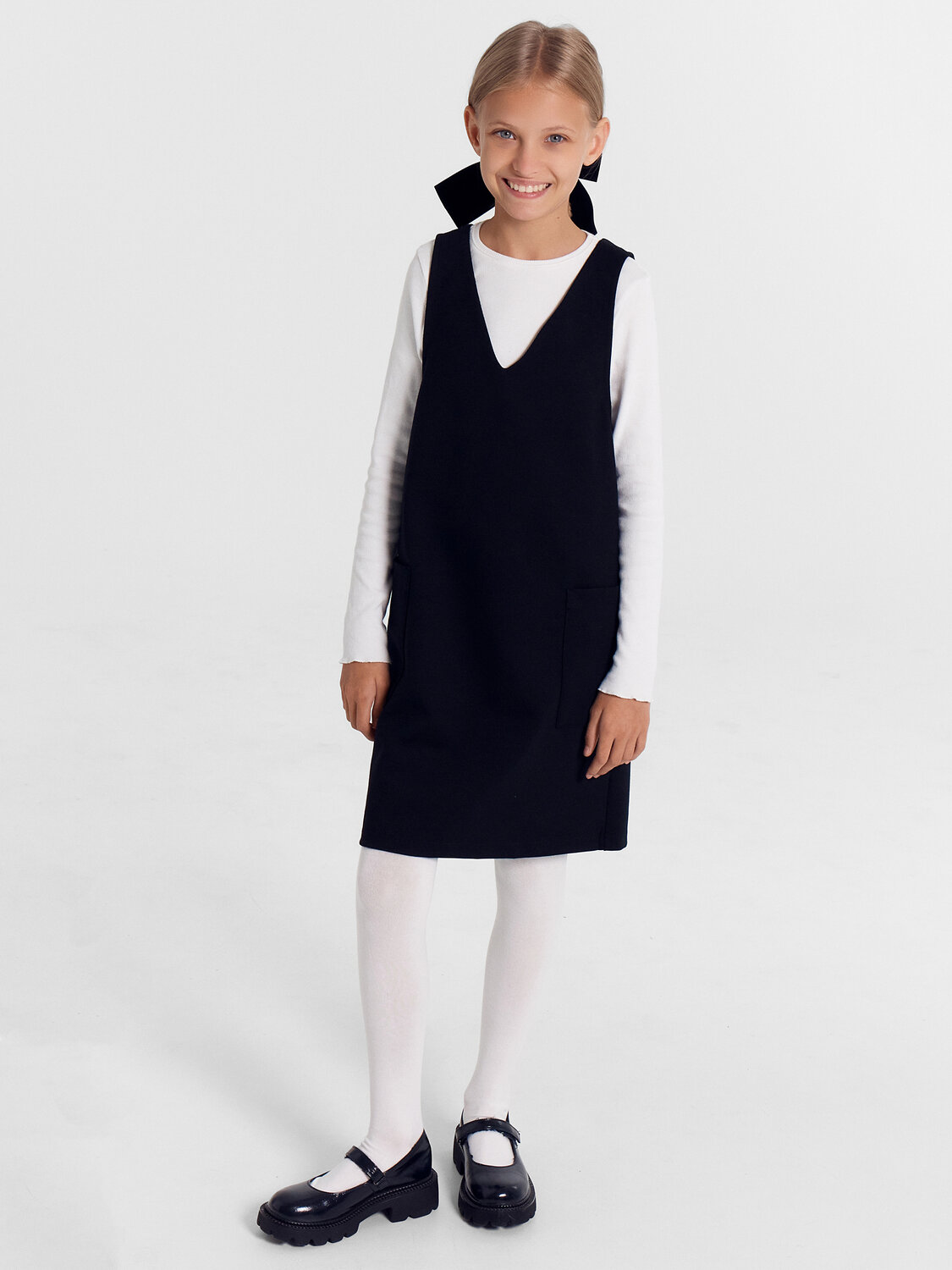 Сарафан для девочек прямого силуэта. Треугольный вырез горловины, длина выше колена. Проймы обработаны в "чистый край". По боковым швам сарафана накладные карманы. Без подкладки. Без застежки. Низ обработан швом в подгибку.